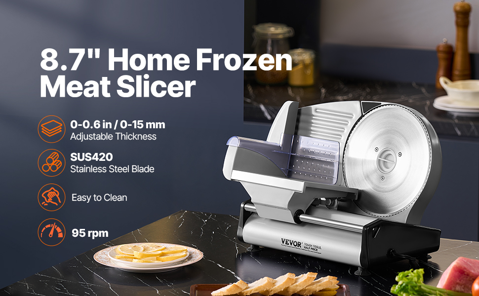 - 8.7" Stainless Steel Blades: Our meat slicer is equipped with two upgraded 8.7" wide SUS420 stainless steel blades, effortlessly handling various food textures such as frozen meat, cheese, ham, and bread.