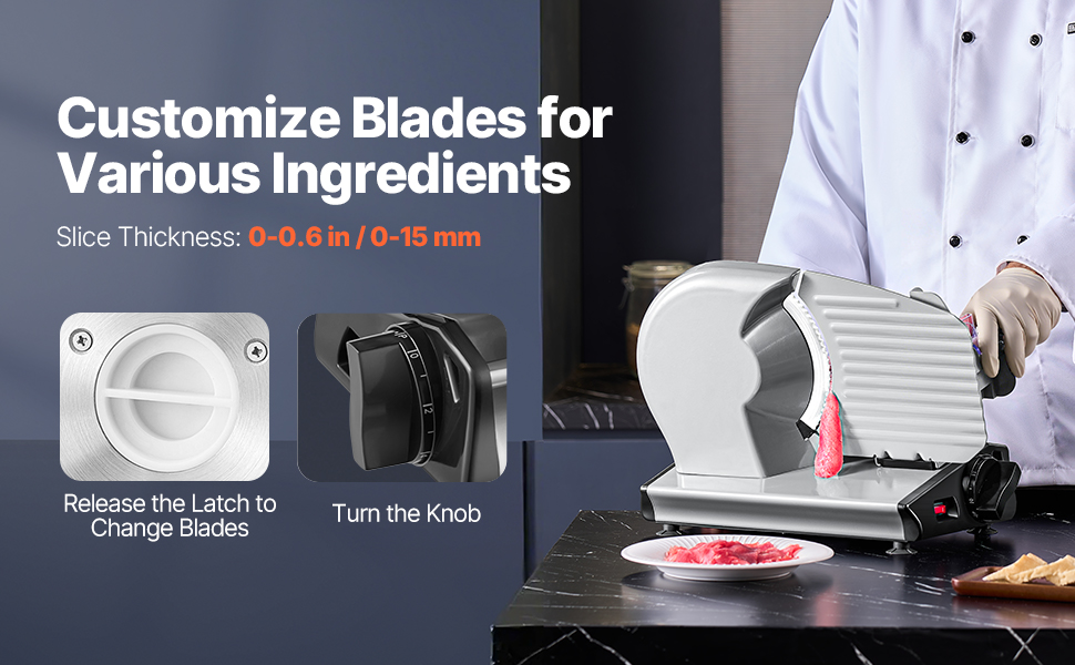- Adjustable Thickness: The deli meat slicer features a thickness adjustment knob with a range of 0–0.6 in (0–15 mm). You can easily customize the thickness to meet your preparation needs. Ideal for making hamburgers, sandwiches, cold cuts, fruit platters, and more.