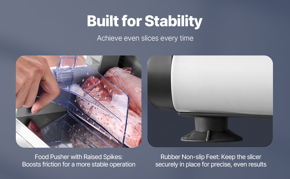 - Stable & Secure: Our deli meat slicer features a raised food pusher with protruding spikes and non-slip feet, ensuring stable and smooth meat slicing. The food pusher effectively enhances user safety during operation.