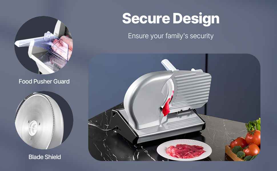 Our meat slicer machine comes with a food pusher guard and a blade shield, keeping you and your family secure while slicing.