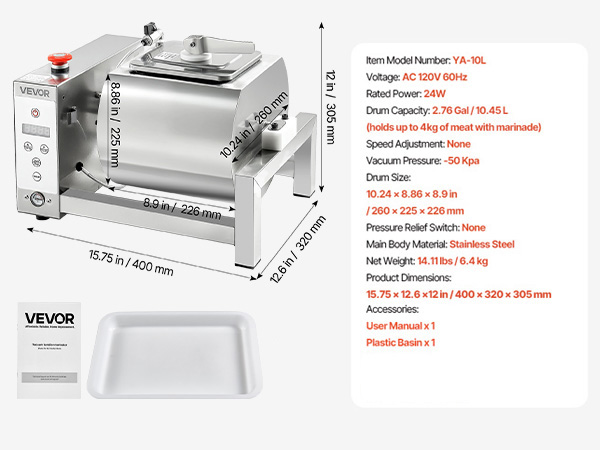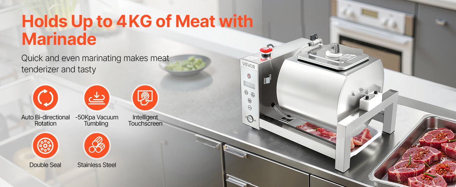 This 10L large-capacity meat tumbler marinator features vacuum marination with -50Kpa vacuum pressure and bidirectional automatic rotation, shortening the time of marinating, ensures more even marination, and results in better taste. It can holds up to 4 kg of meat with marinade.