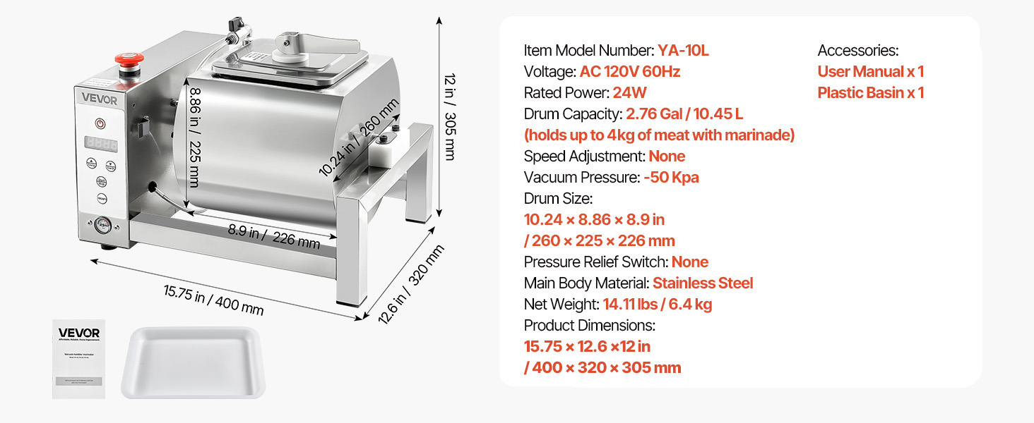 | Drum Capacity | 2.76 Gal / 10.45L (holds up to 4 kg of meat with marinade) |