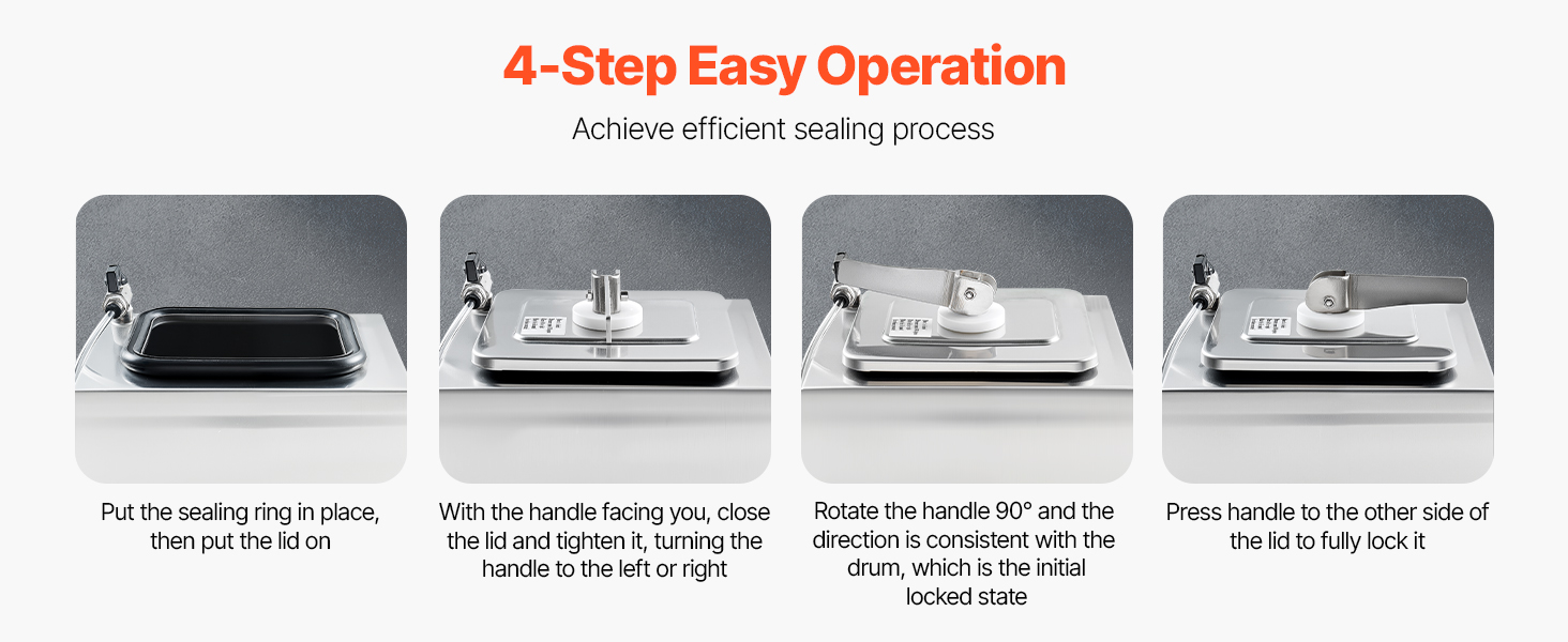The commercial meat tumbler features dual sealing with a silicone seal ring and lid. During regular use, simply follow the correct sealing process to prevent any liquid or air leakage during the 360° rotation.