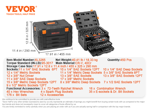 - Diverse Components: This mechanic tool kit is your versatile partner, ideal for car care, DIY projects, and equipment maintenance. Featuring a range of socket sizes, it enables effortless handling of various tasks. Robust construction and precision engineering ensure stability and reliability.