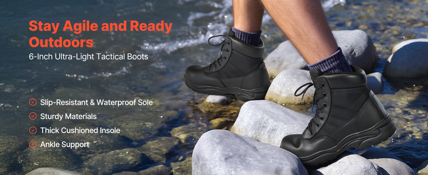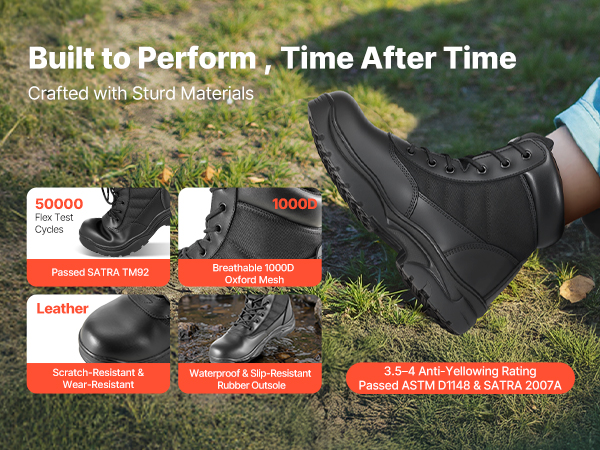 - Full Ankle Support: These 6-inch/152.4mm combat trooper boots provide excellent ankle support and stability, featuring 6 pairs of eyelets that meet SATRA TM149 testing standards, ensuring secure lacing and a comfortable fit for any outdoor activity.