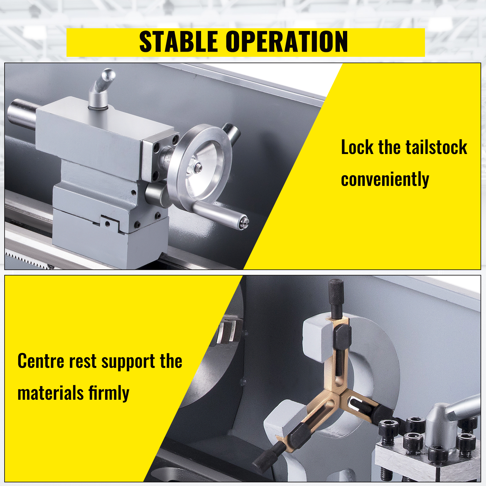 The lathe machine has a center rest and a tailstock that supports the longitudinal rotary axis of a workpiece that you are going to process.