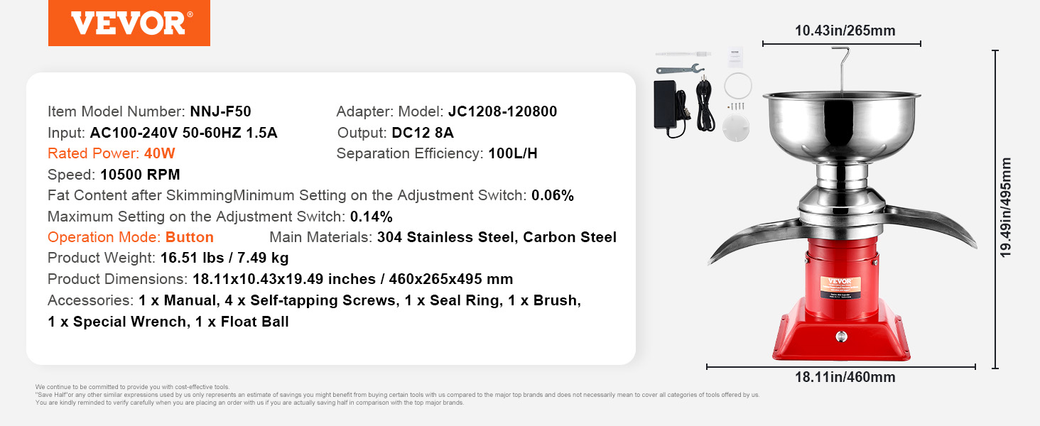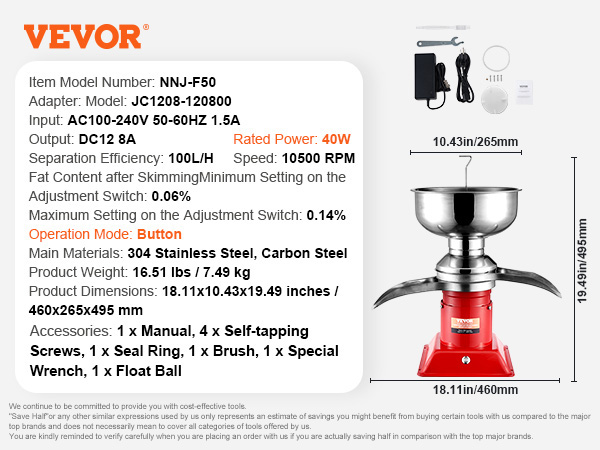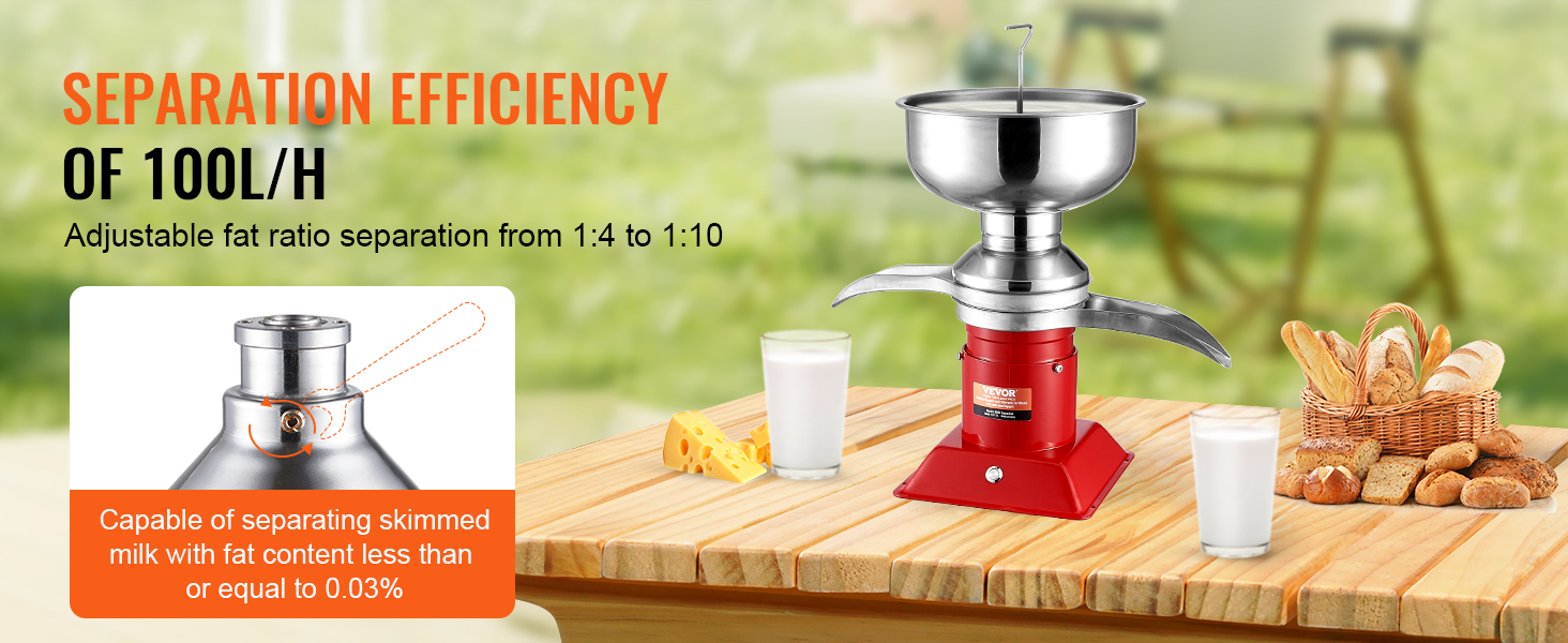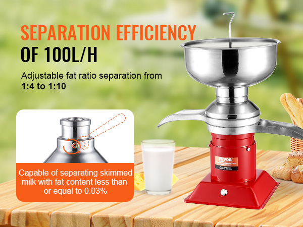 - High Efficiency: Equipped with a 30W pure copper motor and a large-capacity milk tank (5L/1.32 gallons), this milk cream centrifugal separator delivers high efficiency, thoroughly separating milk at up to 100L/H (26.4 gallons) per hour—ideal for households and farms.