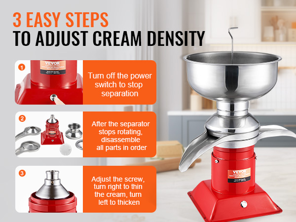 The thickness can be adjusted by tightening or loosening the screw; turning the screw to the right thins the cream, and turning it to the left thickens it, allowing you to easily achieve the desired cream thickness for different needs.