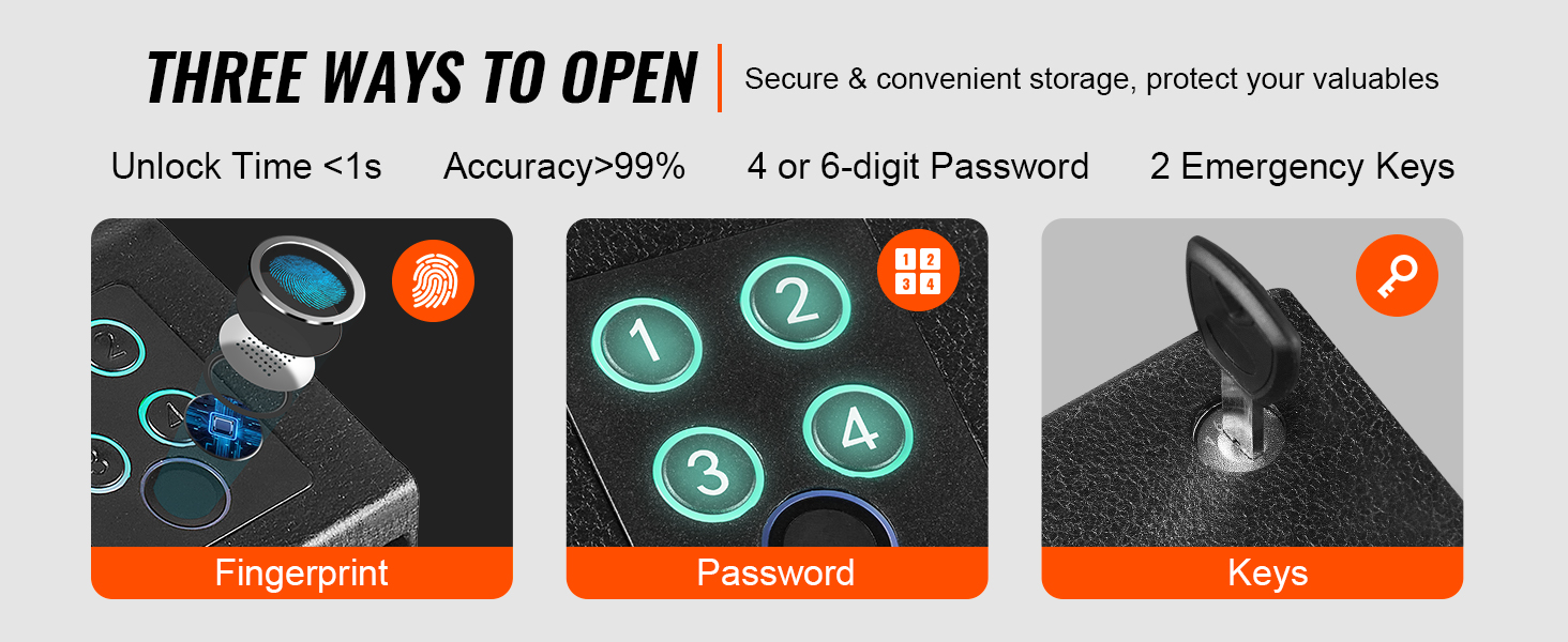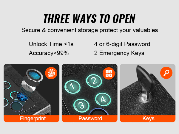 Choose from fingerprint, key, or password three unlocking options with an accuracy rate of over 99% and in less than a second locking time. Set up to 20 fingerprints for easy access. Plus, enjoy the convenience of two keys and a 4-digit password for added security.