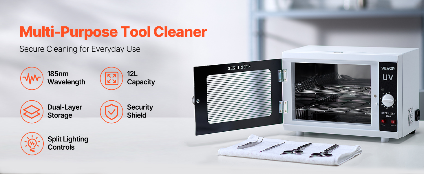 Nail Tool Cleaning Machine, 12L Large Capacity, Knob Control, Tool Cabinet Cleaner Box with Timer Setting, Tempered Glass Door, 185nm Wavelength, for Labs, Home, Nail Salons, Beauty Salons