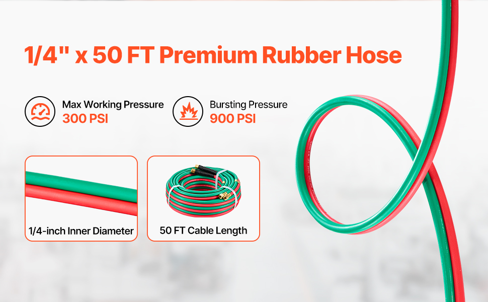 - 50FT Twin Welding Hose: Our 50FT Long x 1/4-inch ID oxygen acetylene hose supports a maximum working pressure of 300 PSI and a bursting pressure of 900 PSI, offering exceptional durability and efficient gas transmission for your welding and cutting tasks.