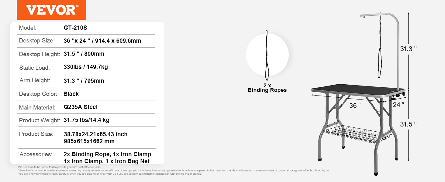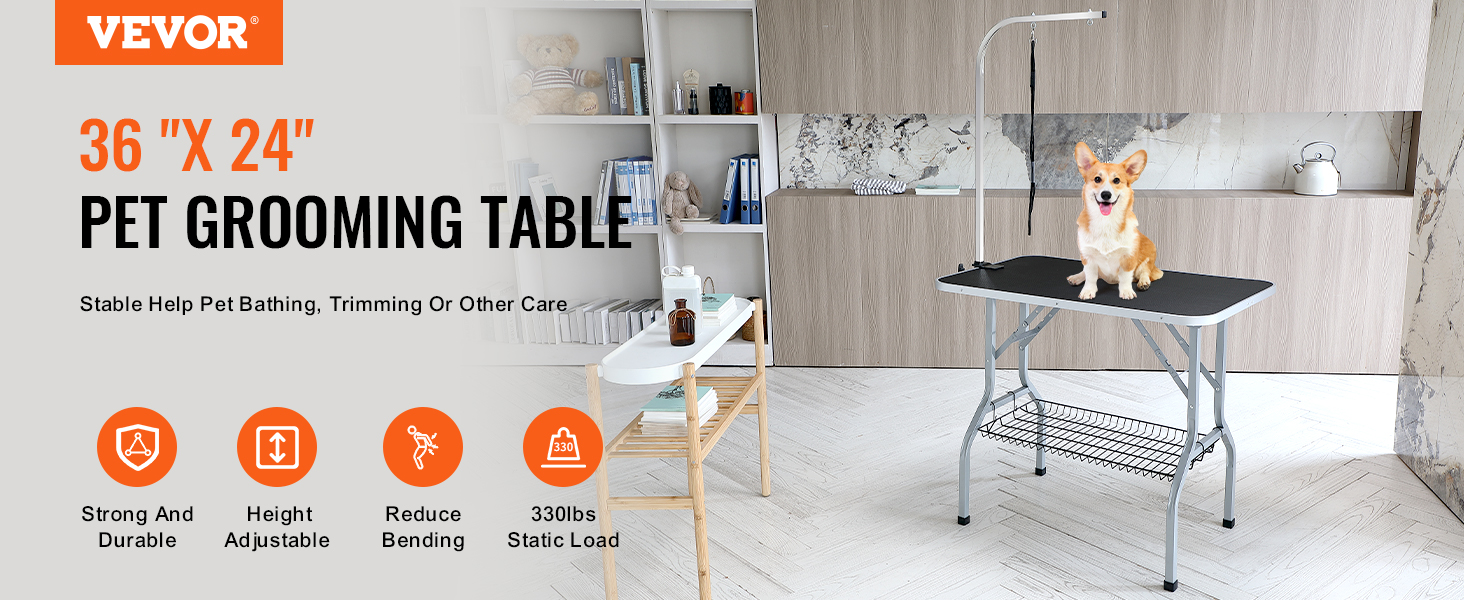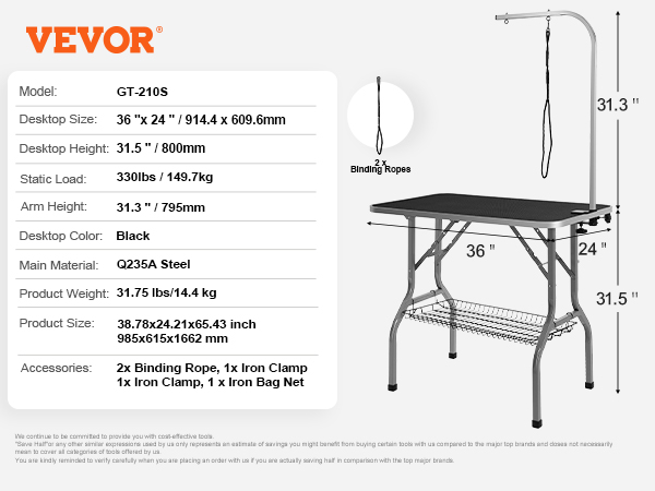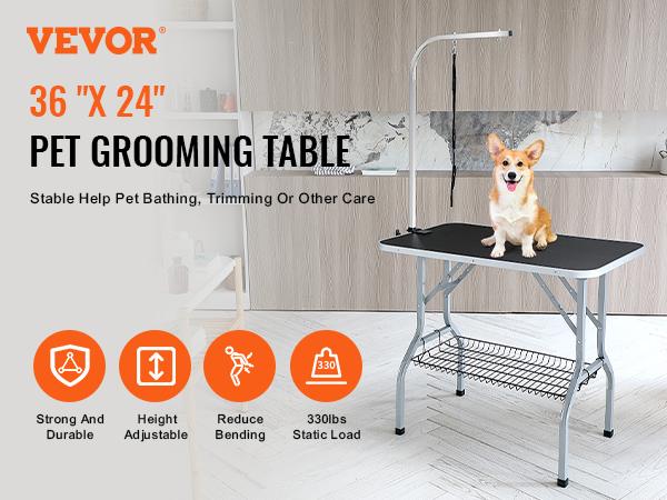 Very happy with my purchase… it’s GREAT! Easy to assemble; sturdy & so helpful with grooming my dog at home. He holds still now & doesn’t resist when I do his legs & tummy. I like that I can disassemble it quickly & store it in my closet until the next month’s groom. Thanks Vevor!