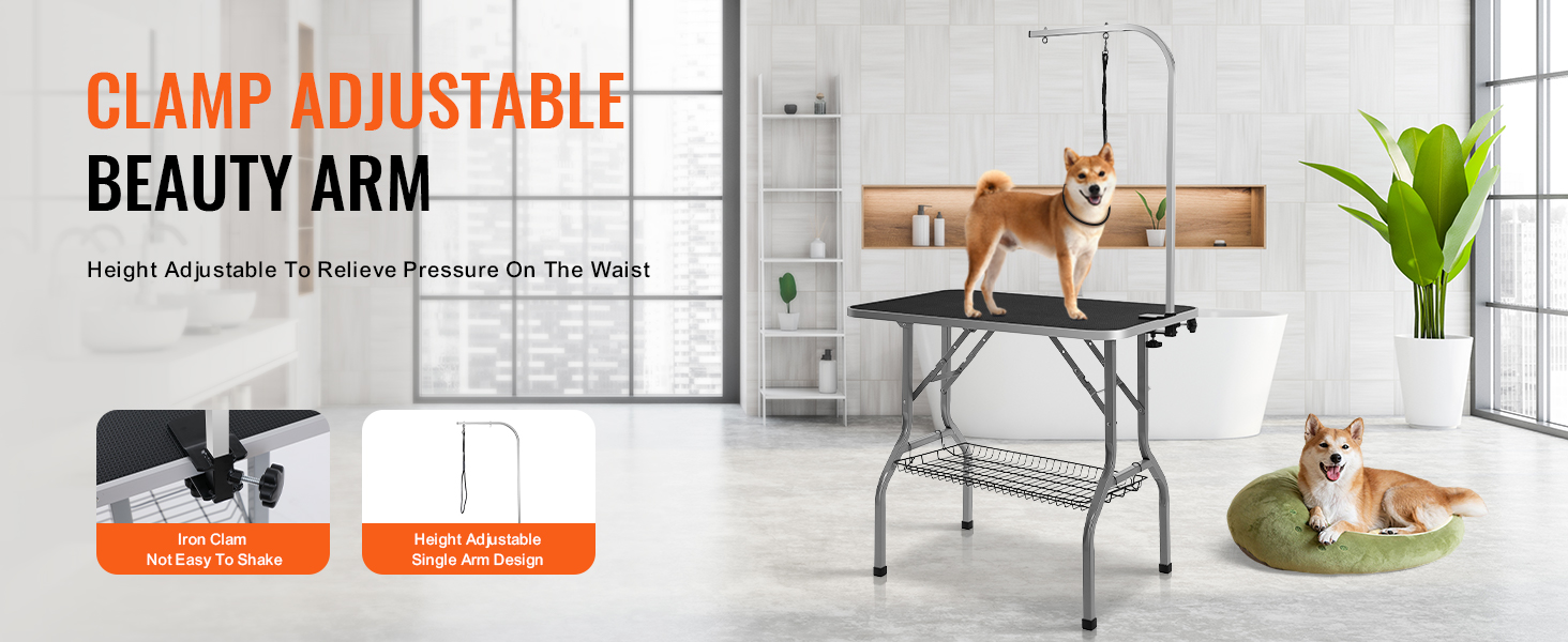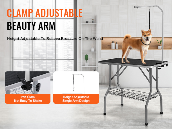 The pet grooming table features a clamp-adjustable grooming arm design, allowing for overall height adjustment and reducing the need for bending. The adjustable H-shaped arm further enhances stability.