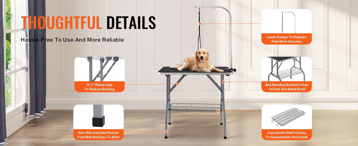 Our pet grooming table boasts several thoughtful design details, including a foldable anti-bend support frame that stays sturdy, dual dog leash design for secure pet restraint, and non-slip, heat-resistant rubber foot pads that prevent sliding, ensuring a convenient and safe experience for your pet.