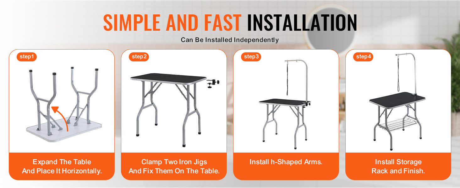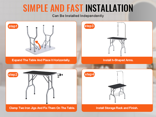 - Easy Installation: This pet grooming table is quick and simple to install with just four steps: Step 1 – unfold the grooming table and place it level; Step 2 – clamp the two iron fixtures securely onto the table; Step 3 – attach the H-shaped double arms; Step 4 – finally, install the storage shelf.