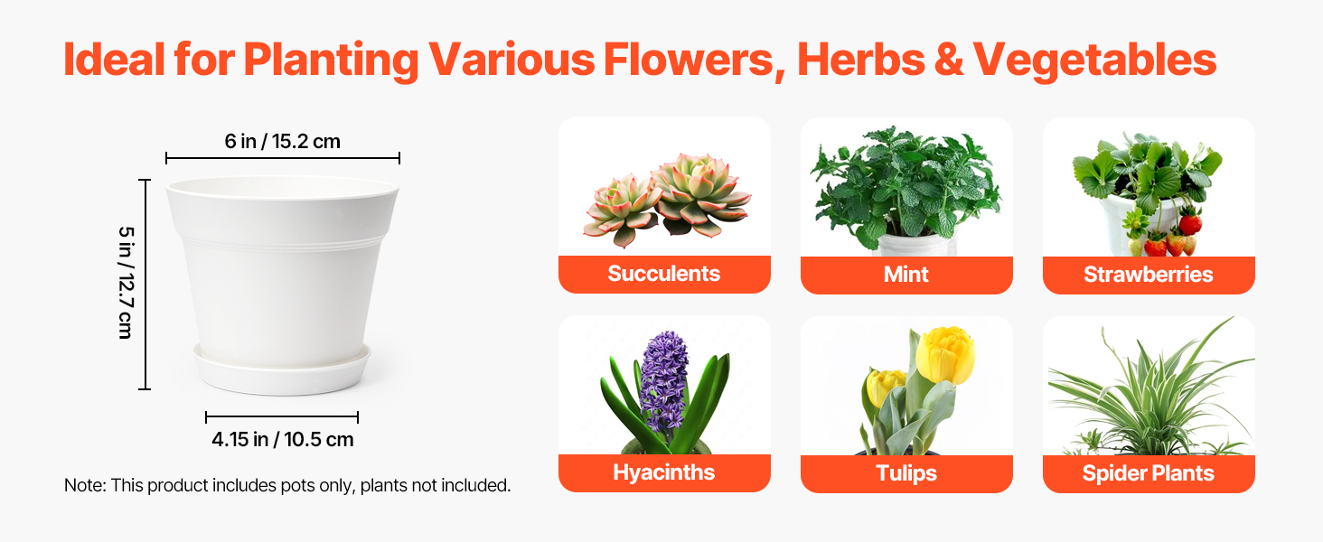 - Round Tapered Planter Pots: This set includes 16 round tapered planters, each with a 6 in / 15.2 cm diameter, 4.15 in / 10.5 cm bottom diameter, and a height of 5 in / 12.7 cm. Ideal for succulents, mint, strawberries, hyacinths, and tulips, providing ample space for plant growth to create a mini garden. The set only includes planters.