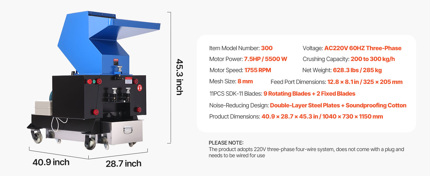 - Multi-Functional Crushing: This plastic shredder crusher features a 7.5HP (5.5KW) pure copper motor, 1755 RPM high motor speed, and 8mm mesh size, delivering 200-300 kg/h powerful crushing capacity. It efficiently shreds a wide range of materials, including PC, PVC, ABS, PET, EPS, PU, HDPE, rubber, leaves, wood, and nylon. (PLEASE NOTE: The product adopts 220V three-phase four-wire system, does not come with a plug and needs to be wired for use)