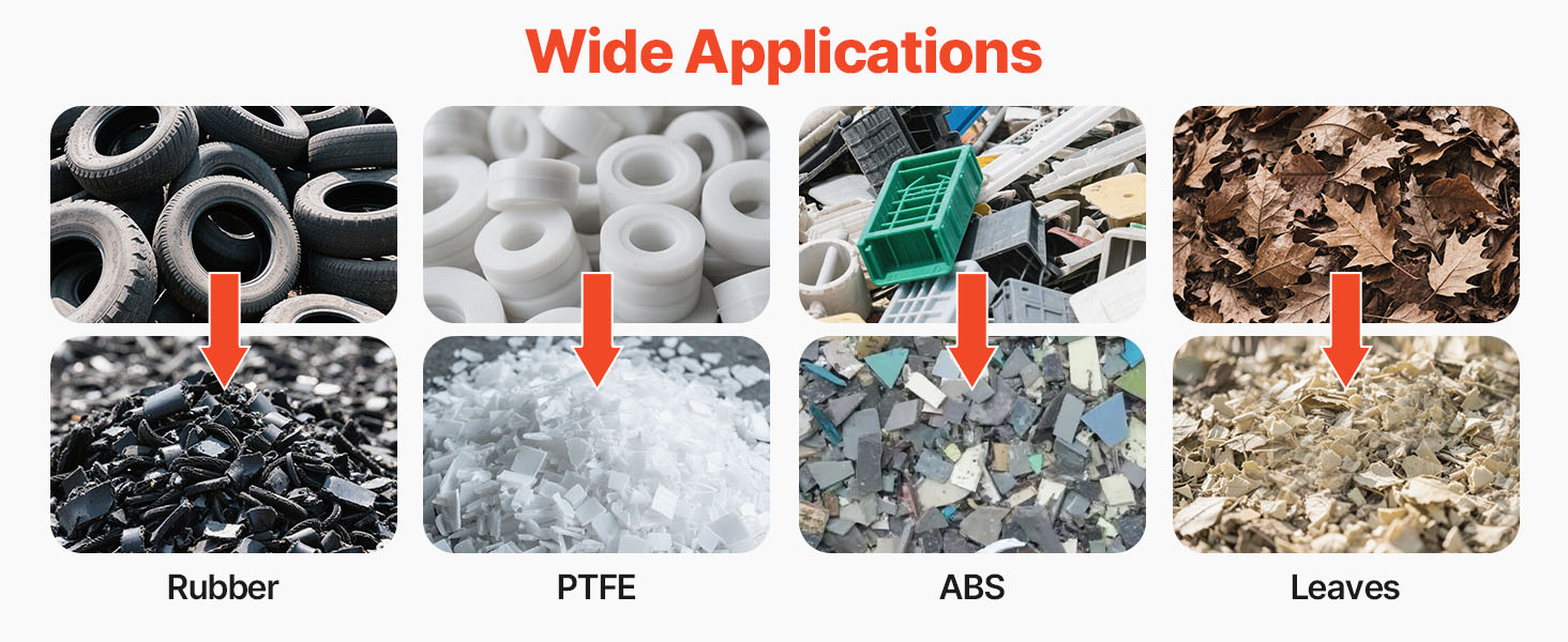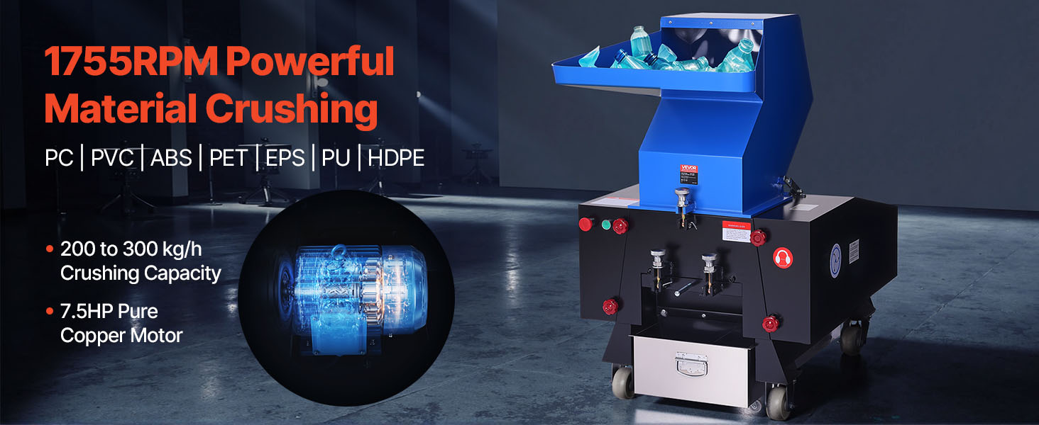 VEVOR plastic shredder crusher is equipped with a 7.5HP pure copper motor, delivering 200 to 300 kg/h powerful crushing capacity. Featuring 1755 RPM high motor speed, 8 mm mesh size and SDK-11 blades, it effortlessly shreds a wide range of materials – PC, PVC, ABS, PET, EPS, PU, HDPE, rubber, etc