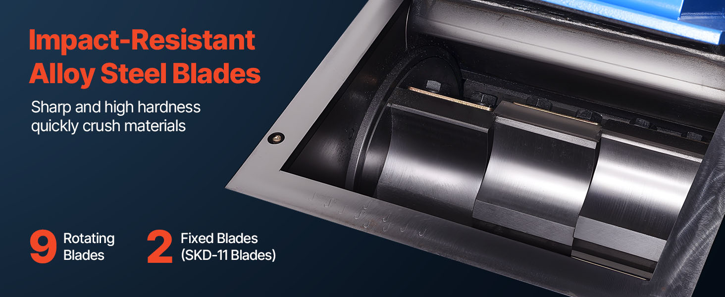 - Alloy Steel Sharp Blades: Our 220V 3-phase plastic shredder grinder comes with 11pcs SKD-11 blades (9 rotating + 2 fixed) made from impact-resistant alloy steel. These sharp, high-hardness blades quickly crush a wide range of materials. They also can be removed, polished, and reused when dull. Note: Avoid shredding glass or metal, as this may damage the blades