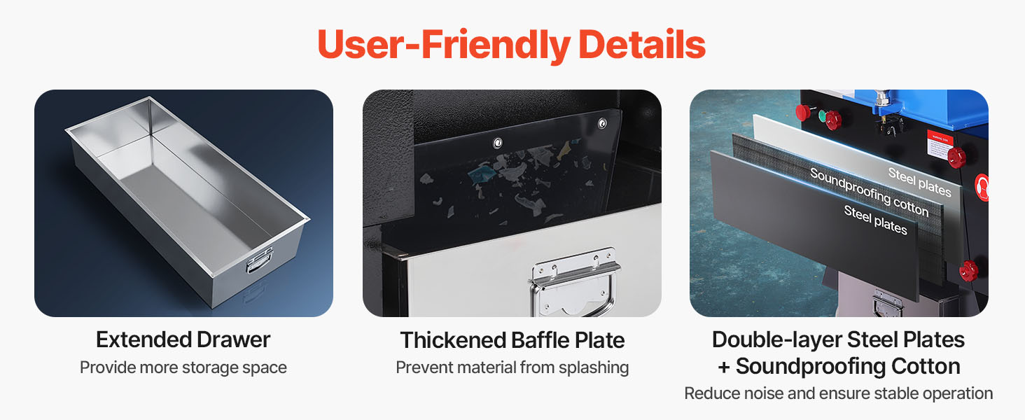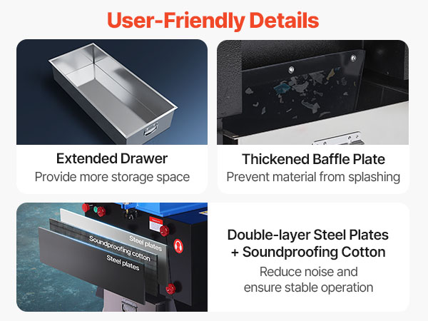 The extended drawer provides extra storage space, while the thickened baffle plate effectively prevents material splashing. The combination of double-layer steel plates and soundproofing cotton ensures stable noise reduction, optimizing your overall user experience.