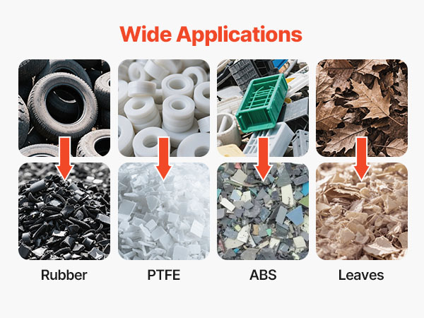 Our plastic chipper granulator is designed to crush numerous materials including ABS, PP, EVA, PC, PS, PVC, PU, PA, rubber products, and leaves, meeting diverse needs. (PLEASE NOTE: The product adopts 220V three-phase four-wire system, does not come with a plug and needs to be wired for use)