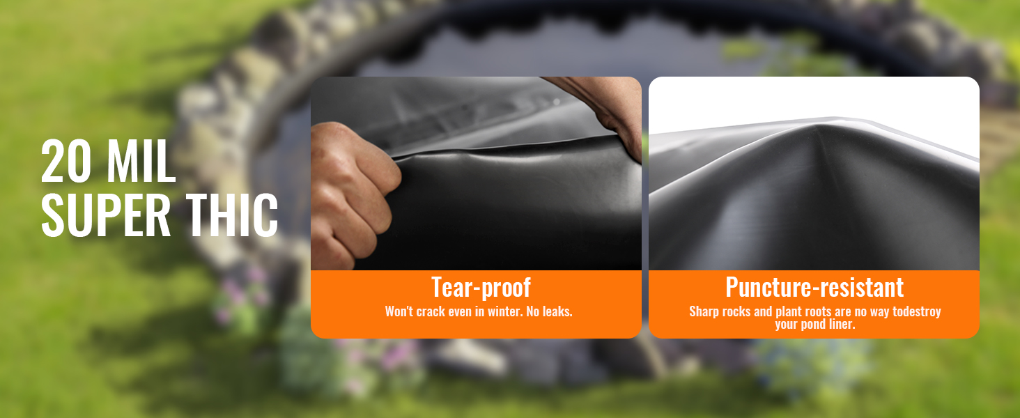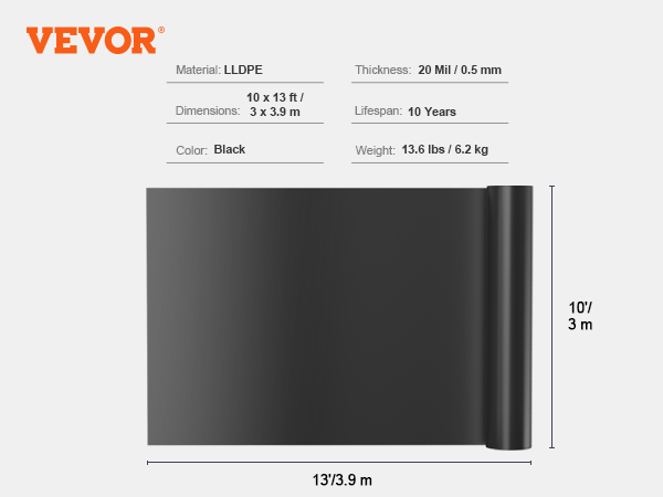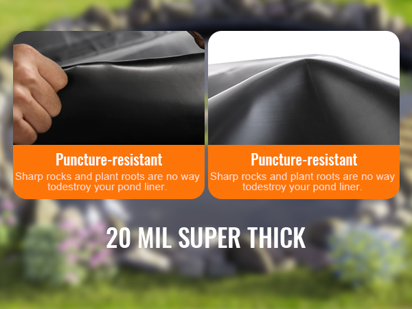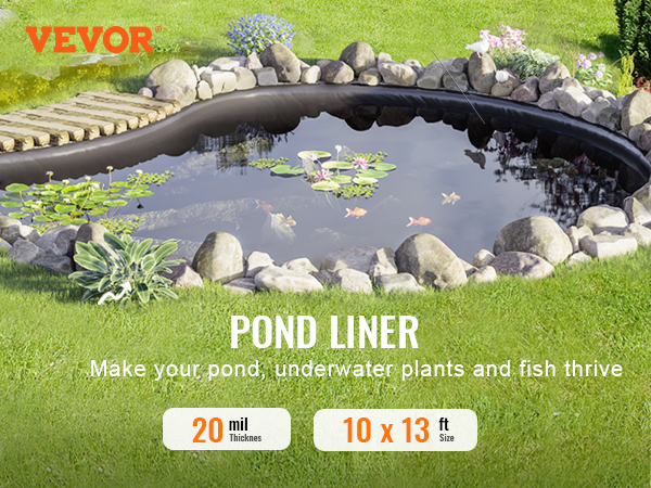 - 20 Mil Super Thick: The pond liner measures 10' x 13' and is engineered to be puncture- and tear-resistant. This ensures protection against sharp rocks and root growth that could otherwise damage the liner. Additionally, it provides a smooth, flat surface that minimizes soil accumulation, simplifying and accelerating pond maintenance.