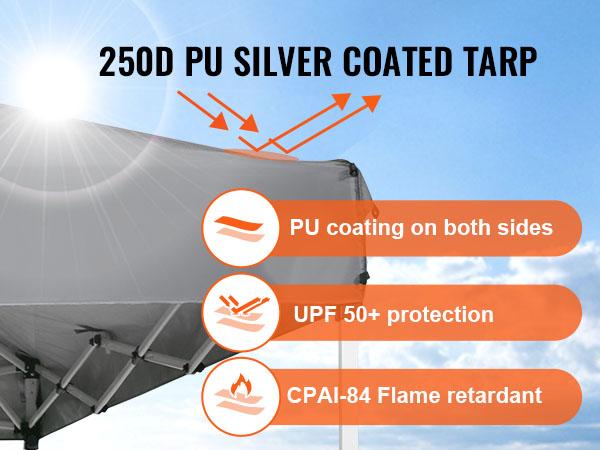 - Quality Meets Performance: Our pop-up tent delivers top-tier features for a safe and comfortable experience. Constructed from 250D PU silver-coated fabric, it offers UPF 50+ UV protection and CPAI-84 flame-retardant properties. Reinforced top cover edging and waterproof stickers on all sides ensure rainwater sheds instantly, preventing accumulation or leakage. Even on rainy days, you can enjoy an uninterrupted party without weather concerns.