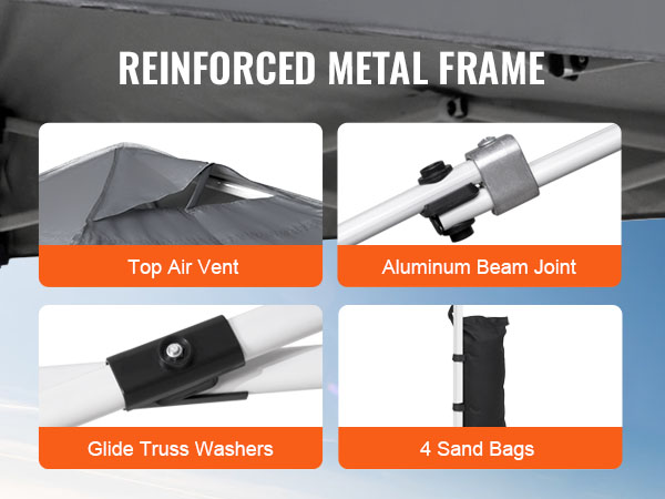 - Reinforced Frame for Peace of Mind: Our canopy tent is built to last, with features that ensure durability and stability. It's made of powder-coated steel pipes, which prevent cracking, rusting, and corrosion. The upgraded aluminum beam joint further enhances stability. Additionally, the glide truss washers and air vent on the top help mitigate wind damage to the support. We provide 4 sandbags as a bonus, providing you with further support on windy days! Stand up to all weather conditions!