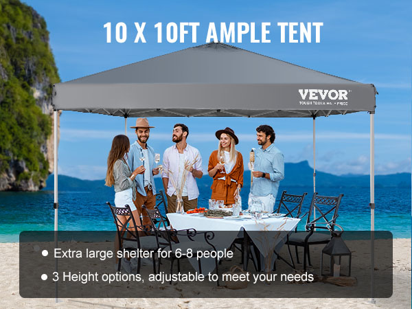 - Large & Comfortable Pop-up Canopy: Have you been dreaming of a temporary party space? Well, get ready to enjoy 100 sq ft for a party in just 1 minute! Our pop-up canopy tent measures 10 x 10 ft and has three adjustable heights, with a maximum internal height of 9ft. It has a spacious design that can comfortably accommodate 6-8 people, making it the perfect place to provide enough shade and keep a crowd impressed.