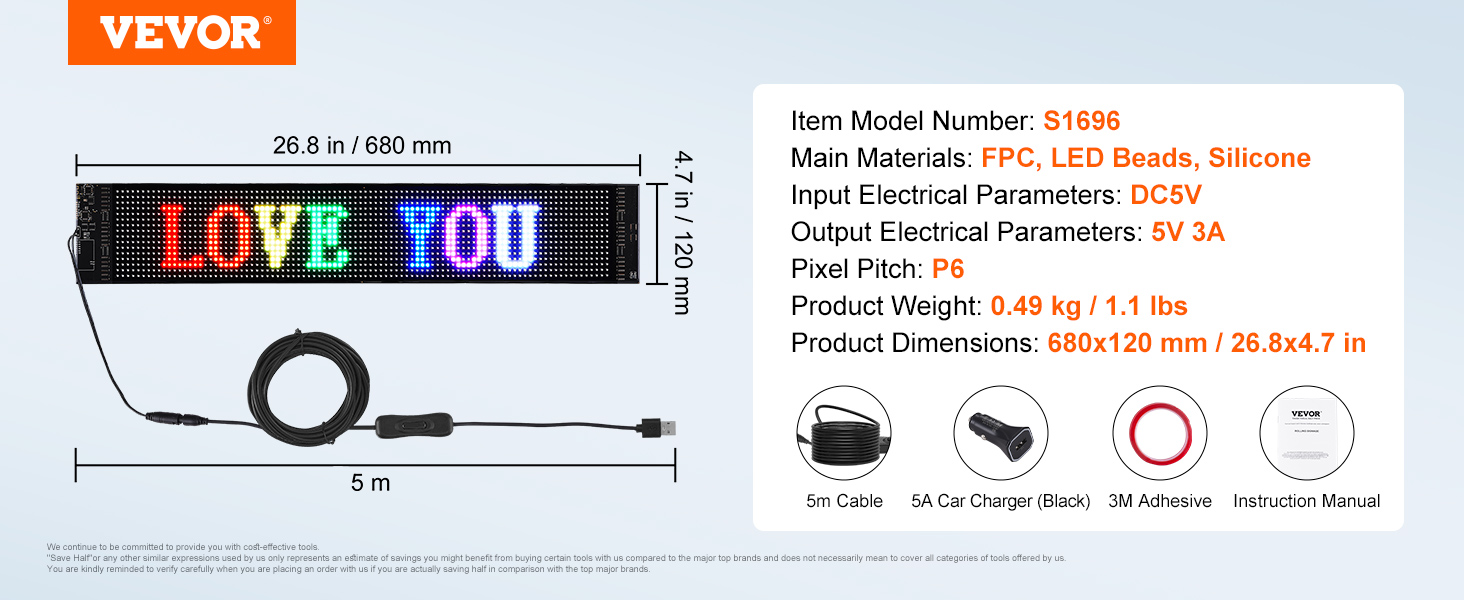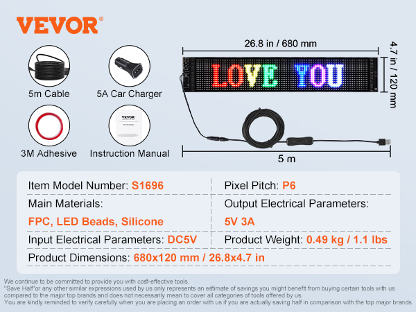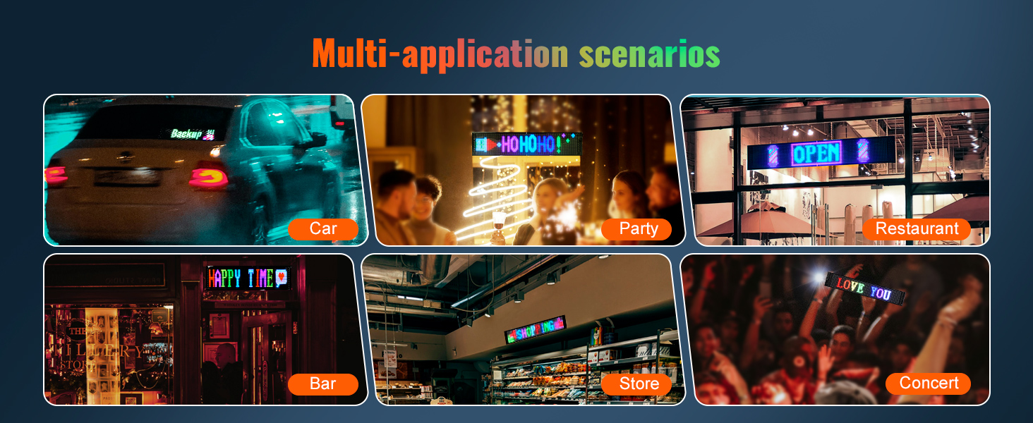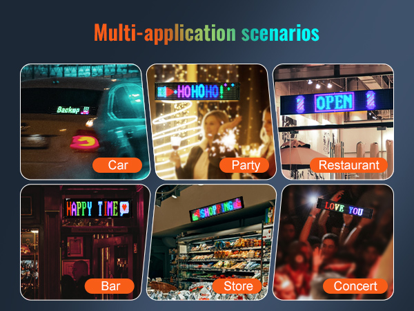 • Convenient Installation and Use: The scrolling display board comes with 3M adhesive tape, which is very sticky and easy to install without the need for suction cups—very convenient and portable. It can be affixed to the rear window of a car, store windows, walls, or other surfaces, and includes a car charger for added convenience.