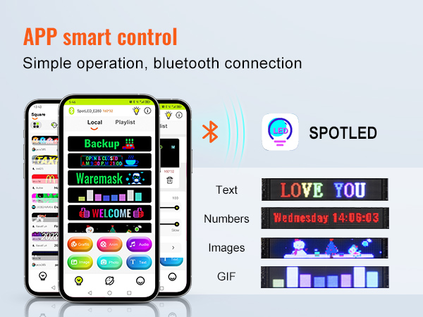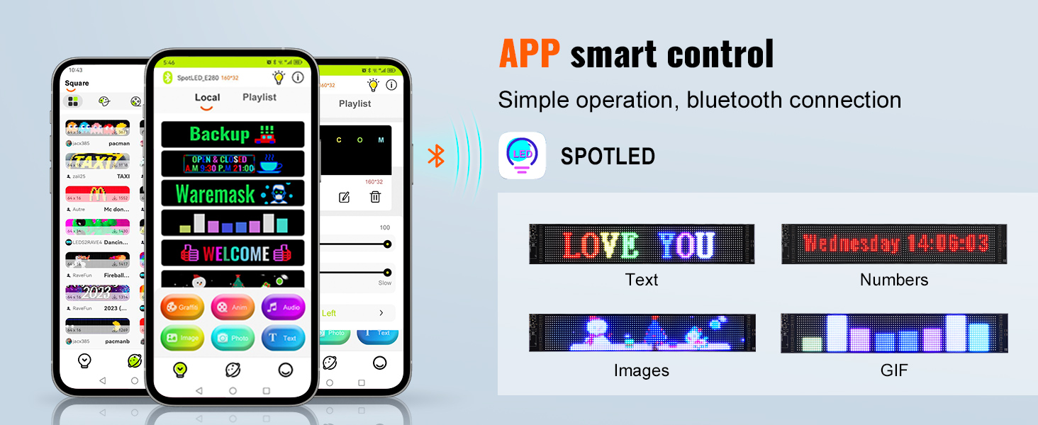 Controlled by connecting to an app via Bluetooth, supports connecting to multiple LED displays simultaneously, making your shop more eye-catching. Supports scrolling text, dates, times, images, and videos, attracting the attention of passersby with colorful, dynamic text displays.