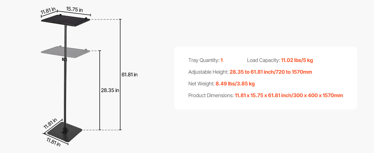 - Flexible Equipment Tray: Equipped with a 15.75 x 11.81 x 0.31 inch / 400 x 300 x 8 mm tray, this projector cart securely holds projectors, laptops, cameras, or speakers using straps and elevated edges. The broad tray and stable frame enhance device compatibility while enabling flexible positioning and use.