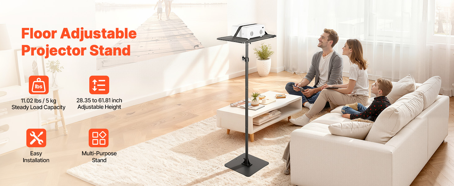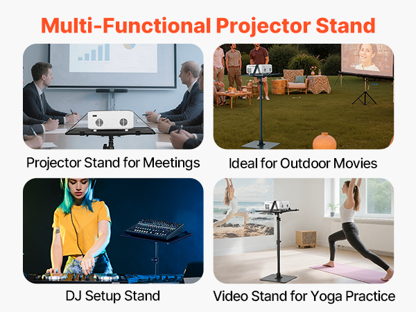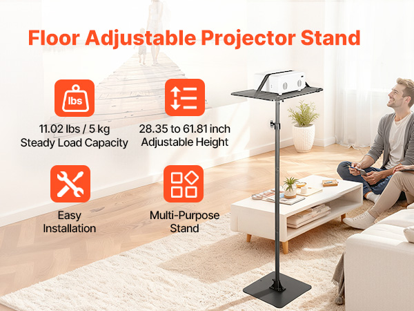 - Adjustable Height Design: This projector shelf stand features tool-free height adjustment via a telescopic pole ranging from 30.31 to 63.39 inch / 770 to 1610 mm. Perfect for sofa viewing, office presentations, or outdoor entertainment, it allows users to quickly find the best angle and maintain a comfortable projection experience.