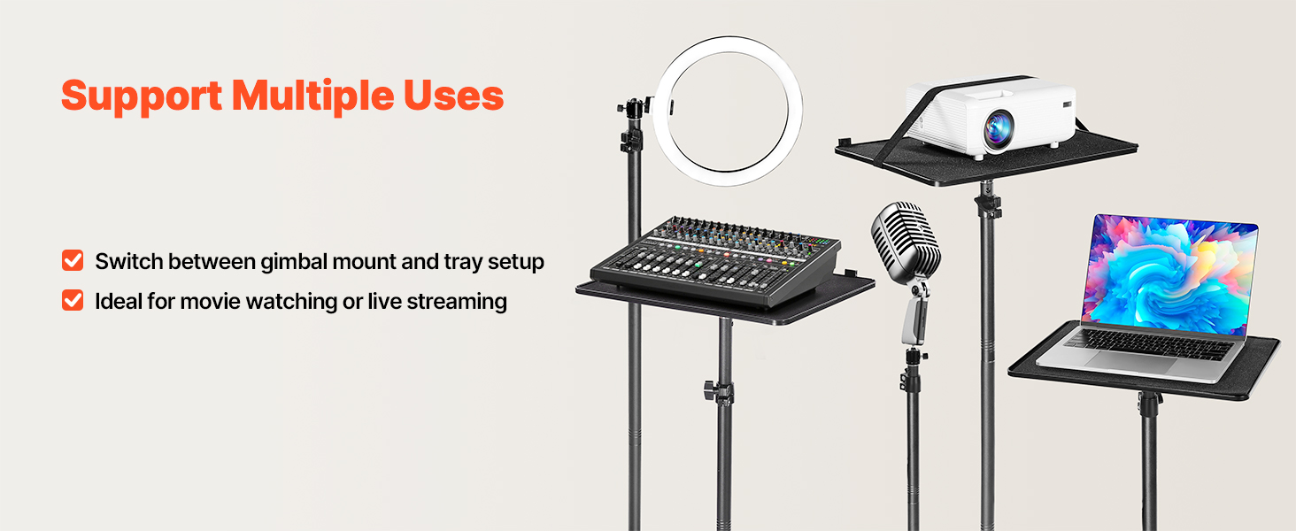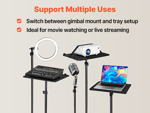 With both tray & gimbal installation options, our projector floor stand holds projectors, laptops, and microphones. From home theaters to streaming or office meetings, it adapts quickly to each task. Switching modes is simple, letting you enjoy flexible and efficient operation in every setting.