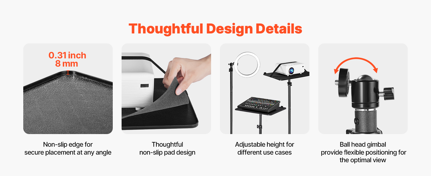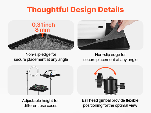 This tall projector stand features 0.31 in / 8 mm thickened tray edges for slip resistance, thoughtfully added soft pads ensure stable viewing without shaking, and adjustable support rods accommodate different height requirements, and a ball head for angle adjustments. Together, these details make it easy to align the image and accommodate different height requirements.