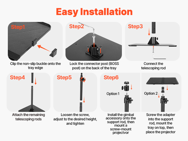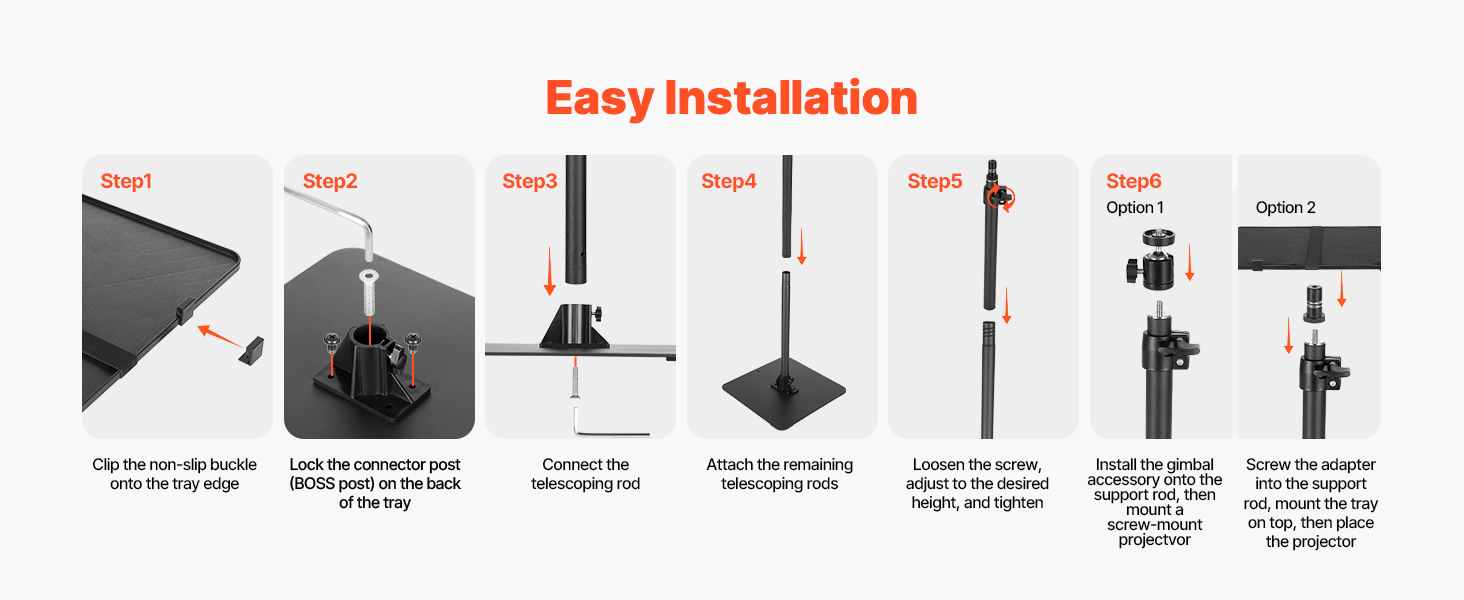 Engineered for convenience, this VEVOR projector stand floor mount requires just six steps for assembly. All necessary screws and tools come included; no outside equipment is needed. Users can handle installation alone with less effort, minimizing setup troubles and enabling faster setup and use.