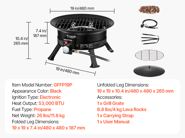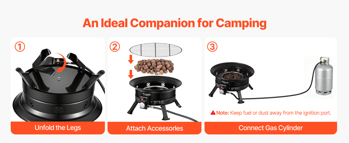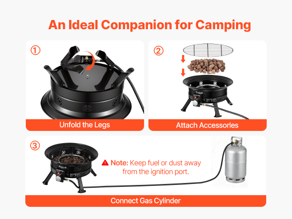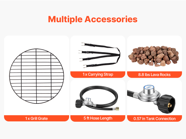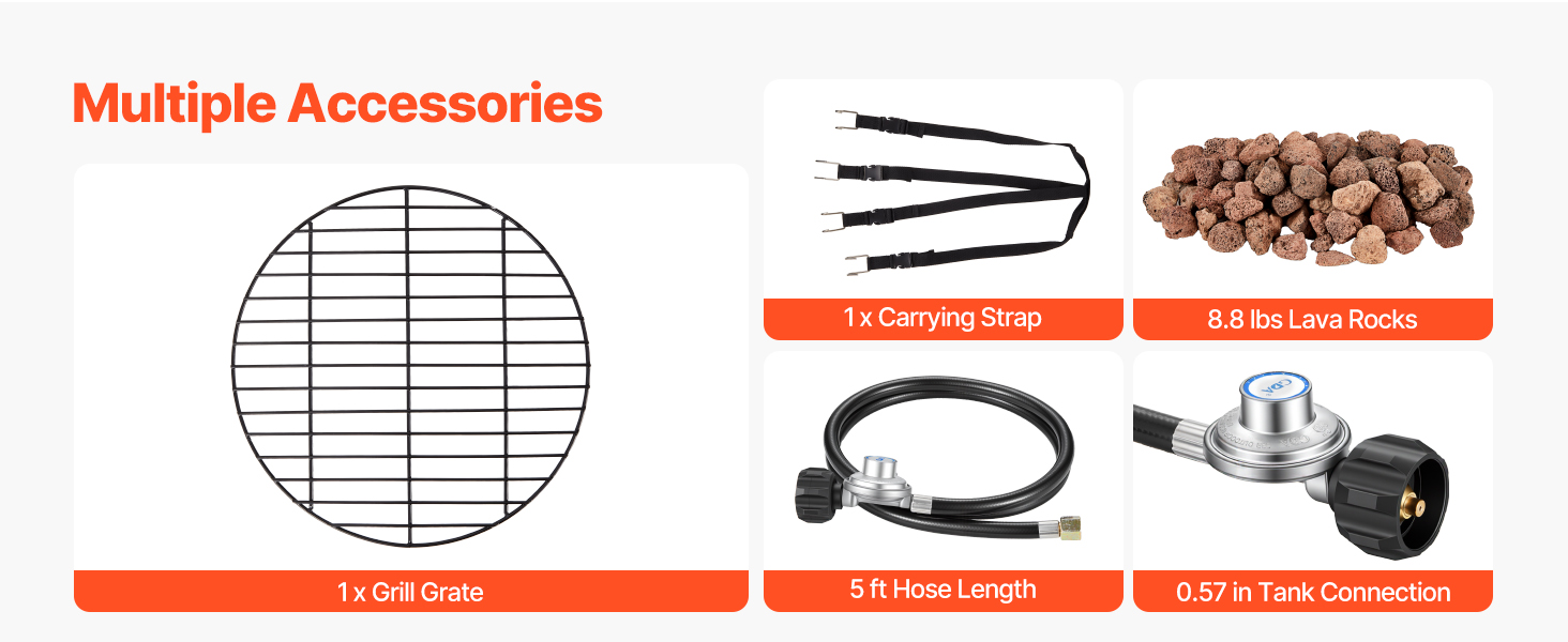 • Complete Set of Accessories: Including lava rocks, a grill grate, a 5 ft extended gas hose, and a 0.57-inch hose connection, our propane firepit fits most gas tanks available on the market