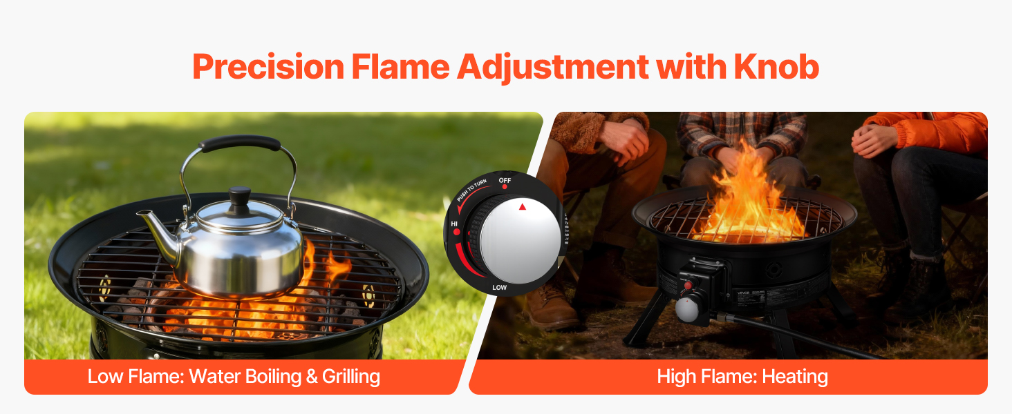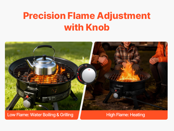 Equipped with a metal knob regulator, this portable propane fire pit allows easy adjustment of flame height with a simple turn. High flames provide quick heating, while low flames are suitable for grilling and outdoor cooking. This flexible adjustment meets your various usage needs.