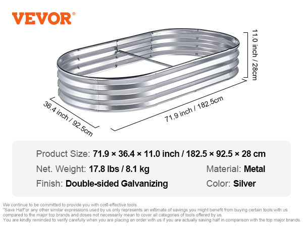 I’m very happy with the VEVOR Galvanized Raised Garden Bed. The size (48.2 x 24.6 x 11 inches) is perfect for flowers, vegetables, or herbs, and it fits nicely in small or large garden spaces. The galvanized metal feels sturdy and durable, and it was surprisingly easy to put together.