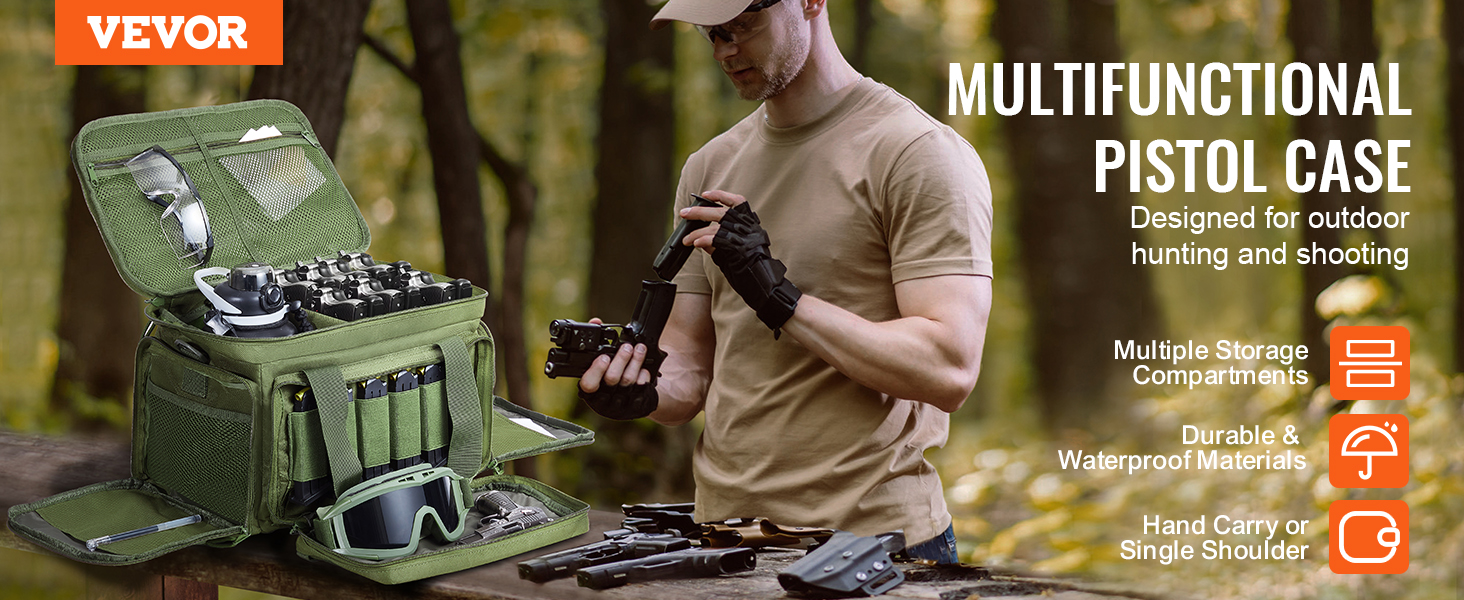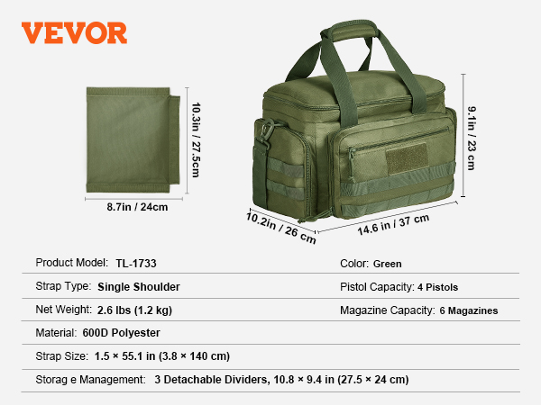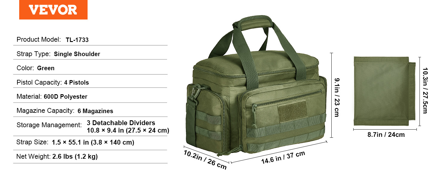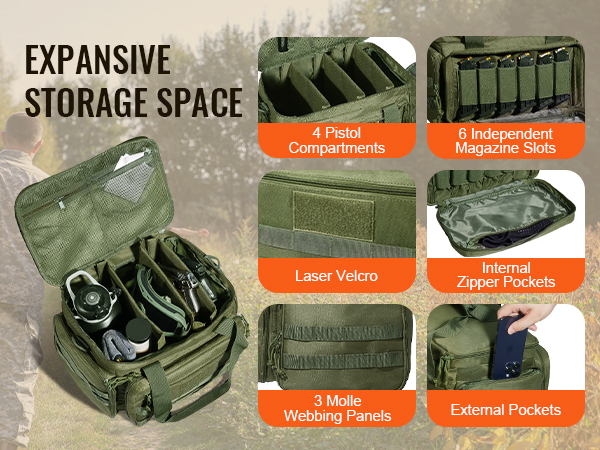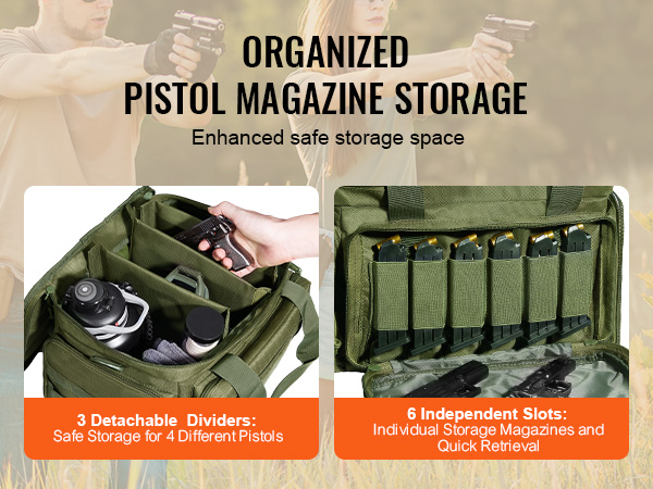 - Spacious Storage: The gun range bag includes 3 removable dividers, allowing storage of up to 4 handguns of various sizes.
