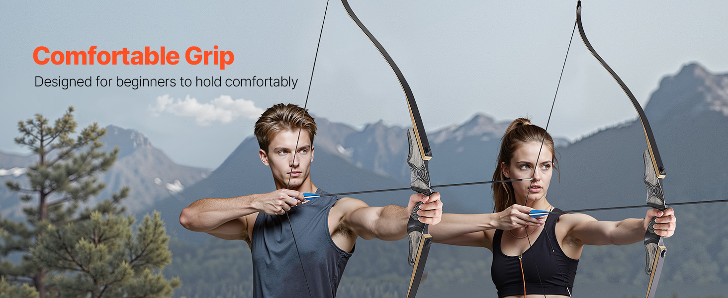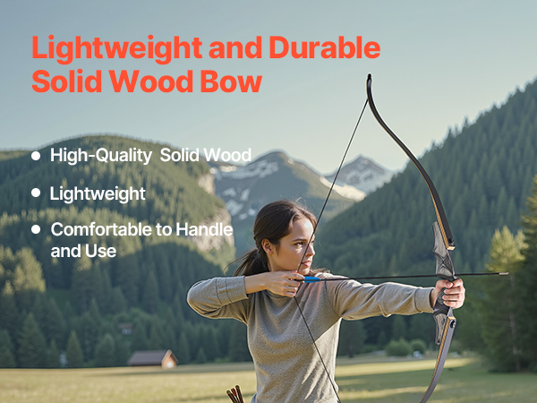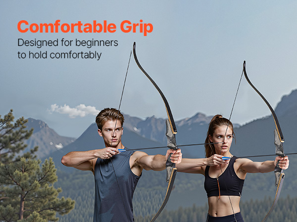 - Ergonomic Design: The recurve bow and arrows kit features a rounded, finely crafted wooden handle that conforms to the natural curve of your hand. This design minimizes fatigue during extended use, enabling sustained focus during archery sessions.