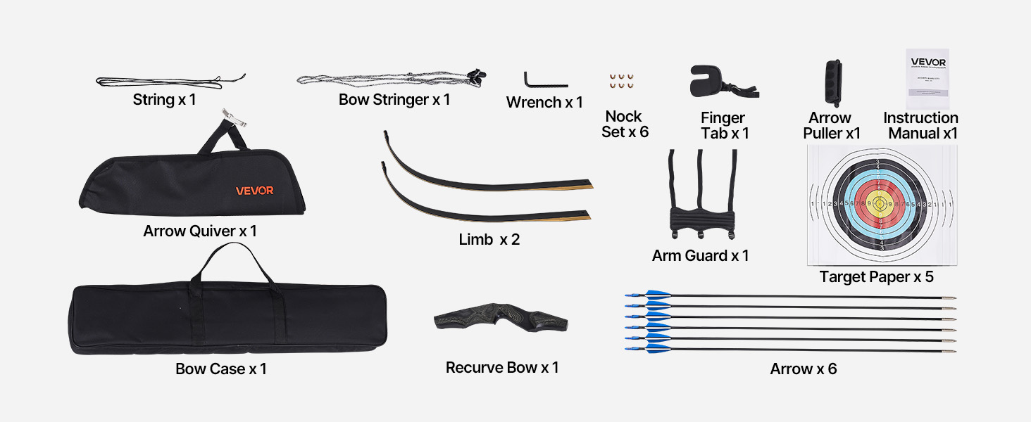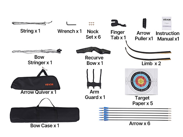 • Complete Set: The hunting target bow includes an instruction manual; 1 recurve bow (with one string); 1 arm guard; 1 finger tab; 1 stringer; 1 felt arrow rest; 1 quiver; 6 fiberglass arrows; 1 bow case; 1 arrow puller; 6 copper nocks; 1 wrench; 5 target papers. A fully equipped set, with no need to purchase additional accessories