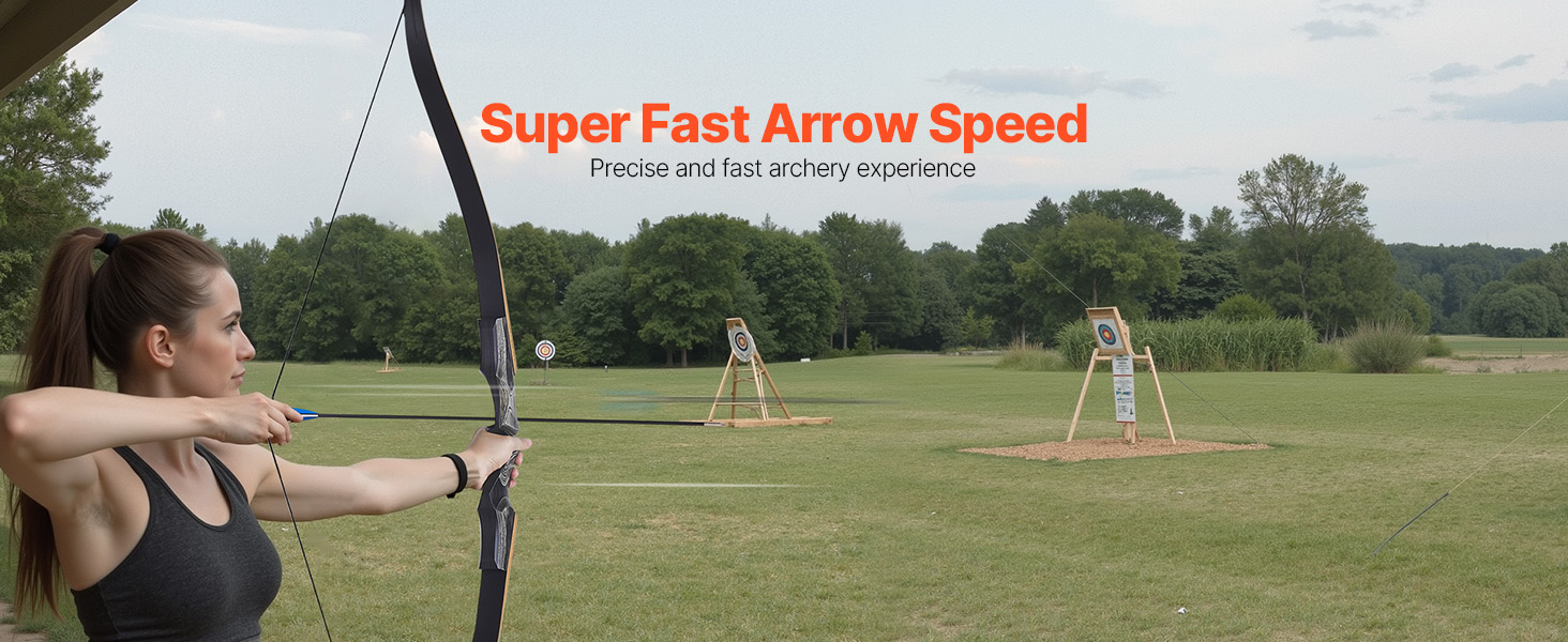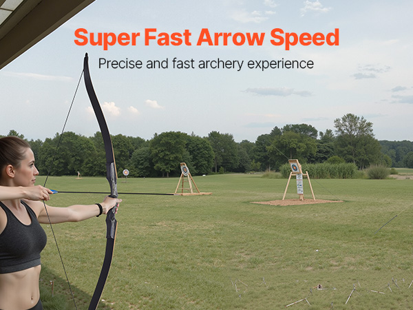 The recurve bow and arrows kit delivers super-fast arrow speeds, providing precise and effortless shooting. The arrows fly smoothly and rapidly, making it suitable for both hunters and archers practicing their skills.