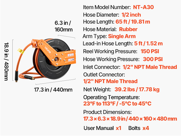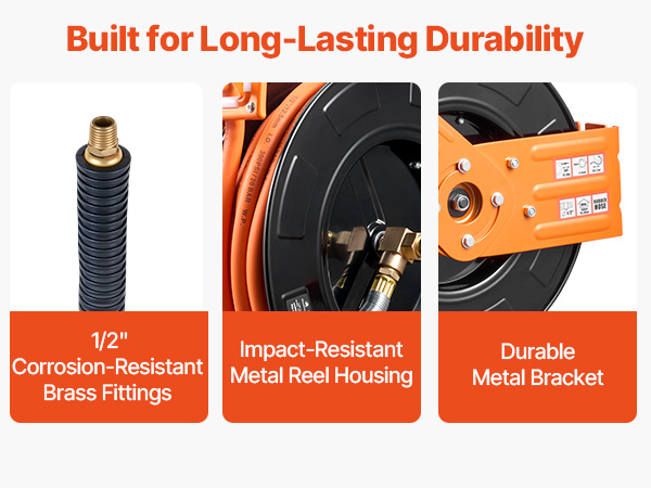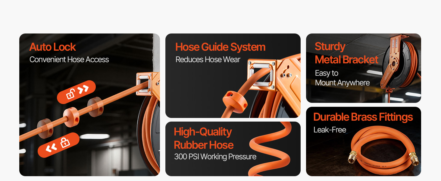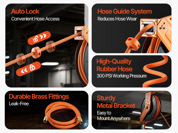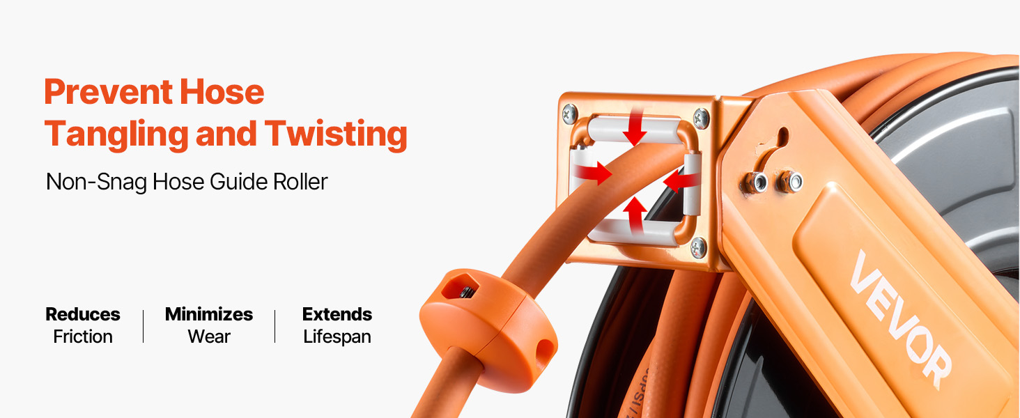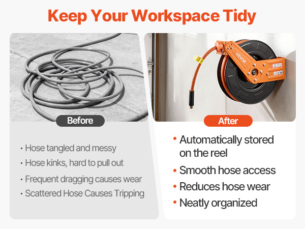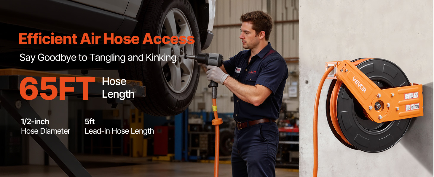 - No More Tangled Hose: The VEVOR retractable air hose reel includes a 1/2 inch x 65 ft rubber air hose and a 5 ft lead-in hose, designed to keep your workspace tidy and tangle-free. Eliminates floor-dragging hoses, reducing wear and tripping hazards for enhanced safety and secure operation.