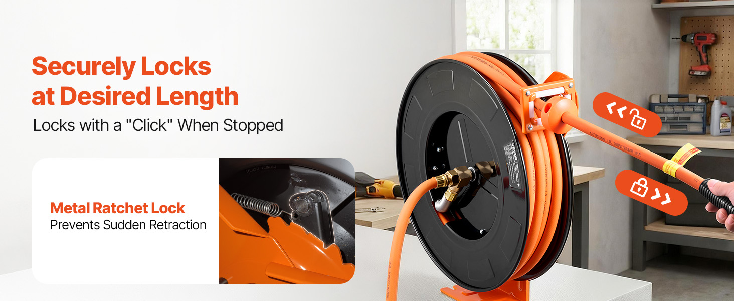 Our auto rewind air hose reel features a built-in locking mechanism that lets you adjust the hose length easily and securely lock it at the desired position.