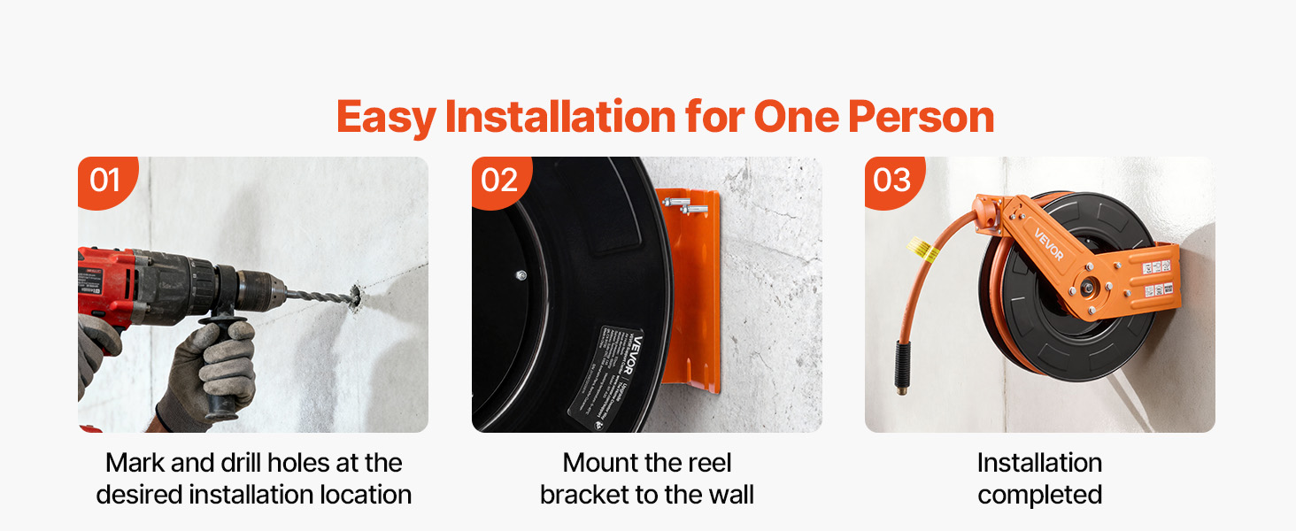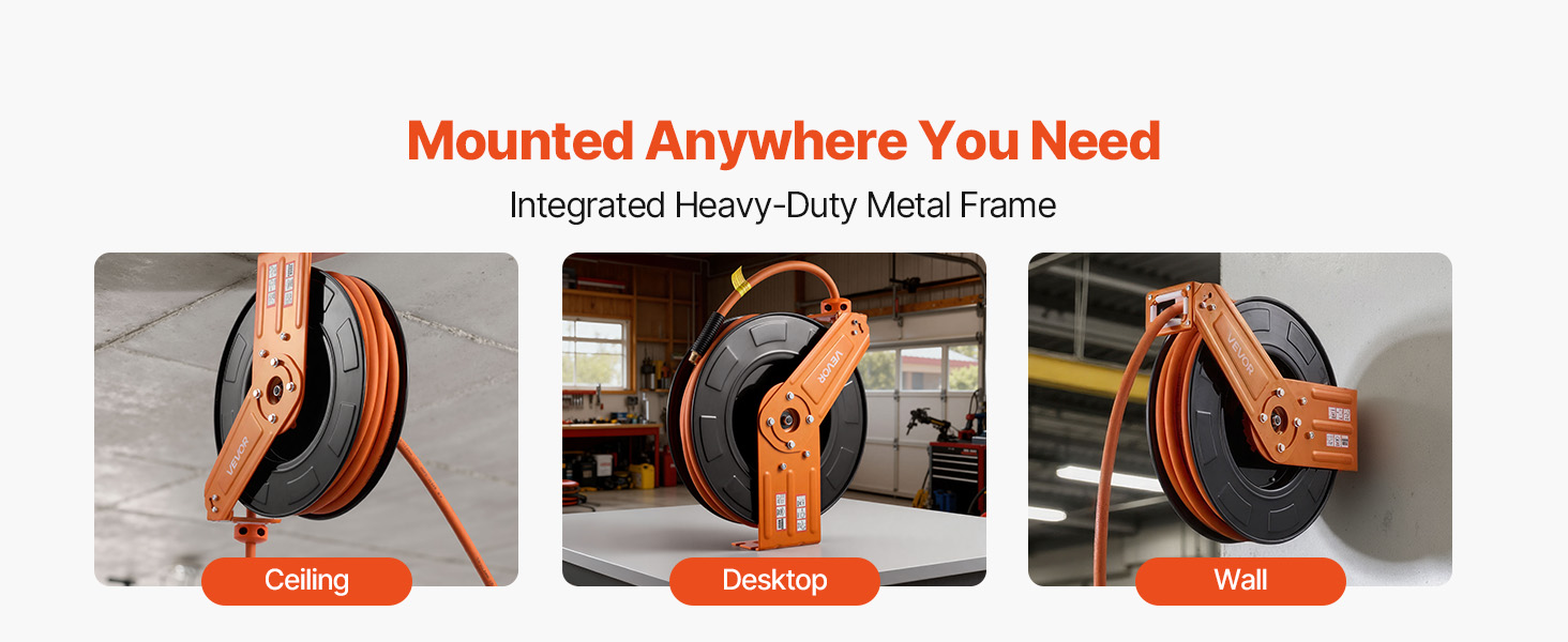 - Easy Installation: Our air compressor hose reel can be mounted on ceilings, walls, or workbenches. Enjoy the convenience of having the air hose within easy reach, ready to use whenever and wherever you need it — no twisting or kinking.