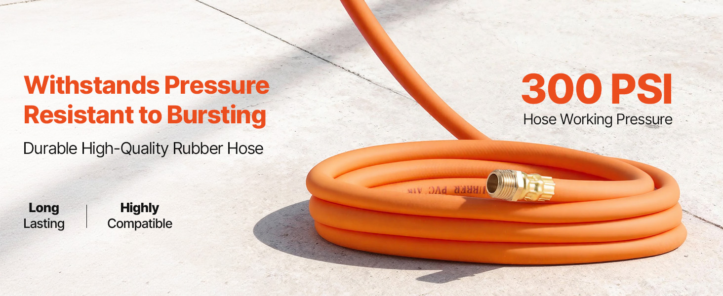 - Durable & Flexible: Our rubber air hose withstands up to 300PSI and operates reliably from 23℉ to 113℉, resisting twisting, crushing, and bursting for smooth airflow. Built-in spring guard and rubber protective sleeve provide extra protection for hose and fitting, reducing bending and wear.