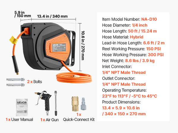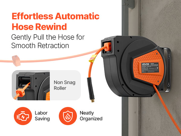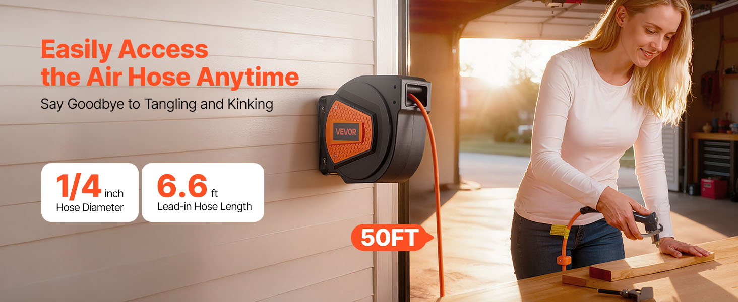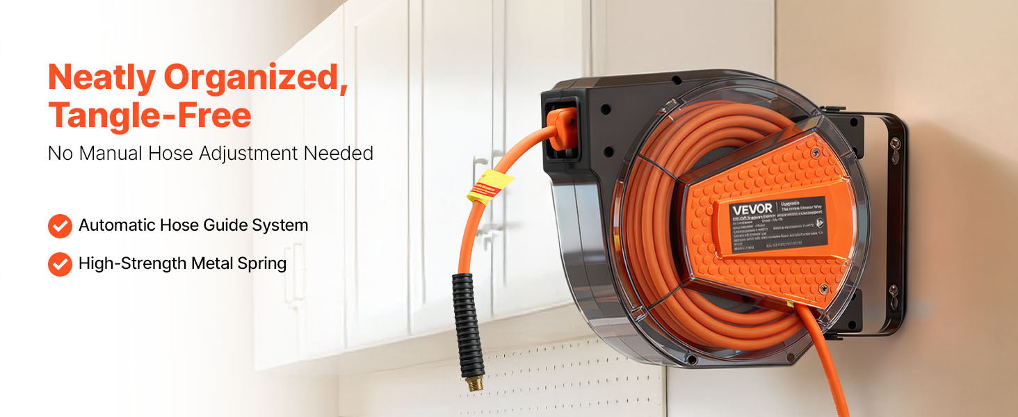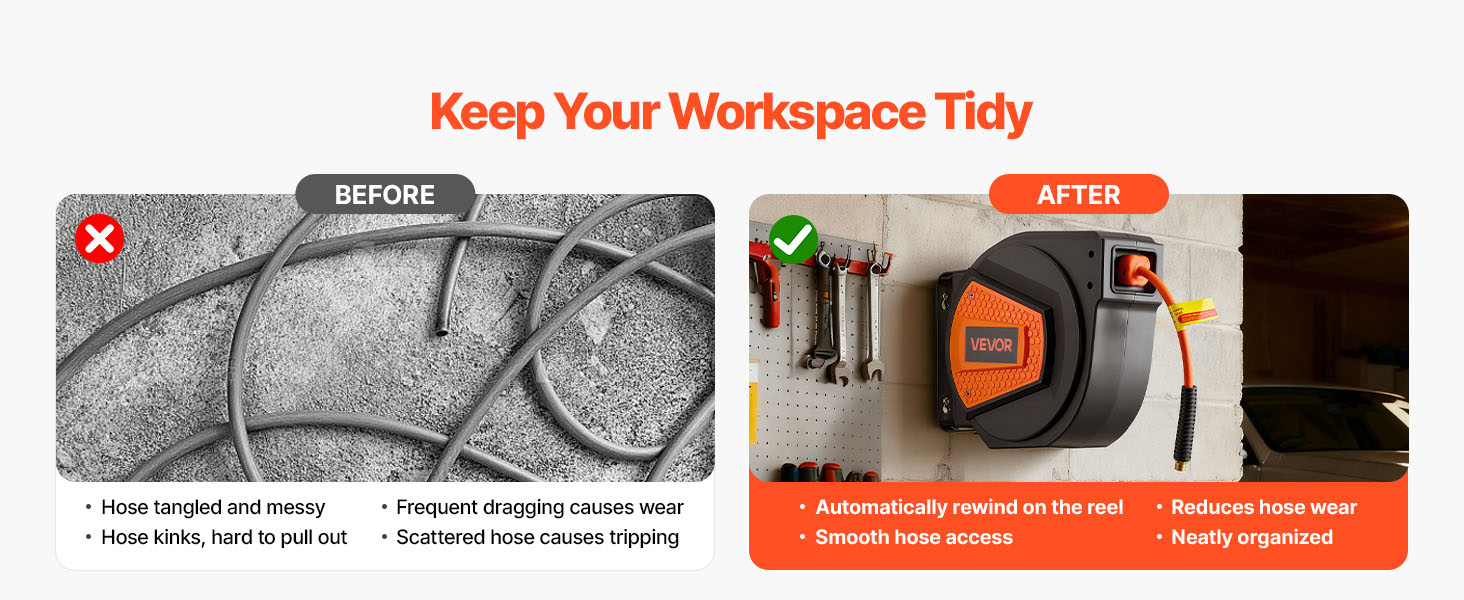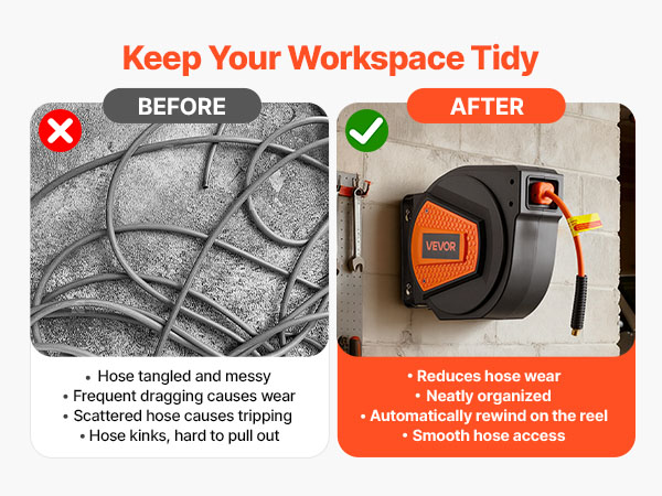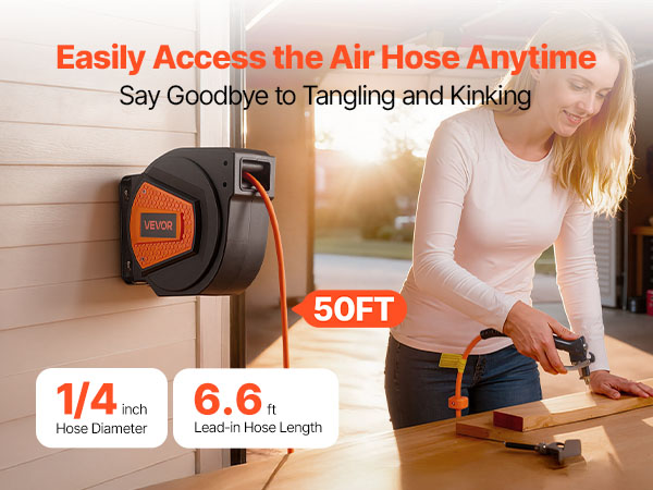 - No More Tangled Hose: The VEVOR retractable air hose reel includes a 1/4 inch x 50 ft hybrid air hose and a 6.6 ft lead-in hose, designed to keep your workspace neat and tangle-free. Eliminates floor-dragging hoses, reducing wear and tripping hazards for enhanced safety and secure operation.