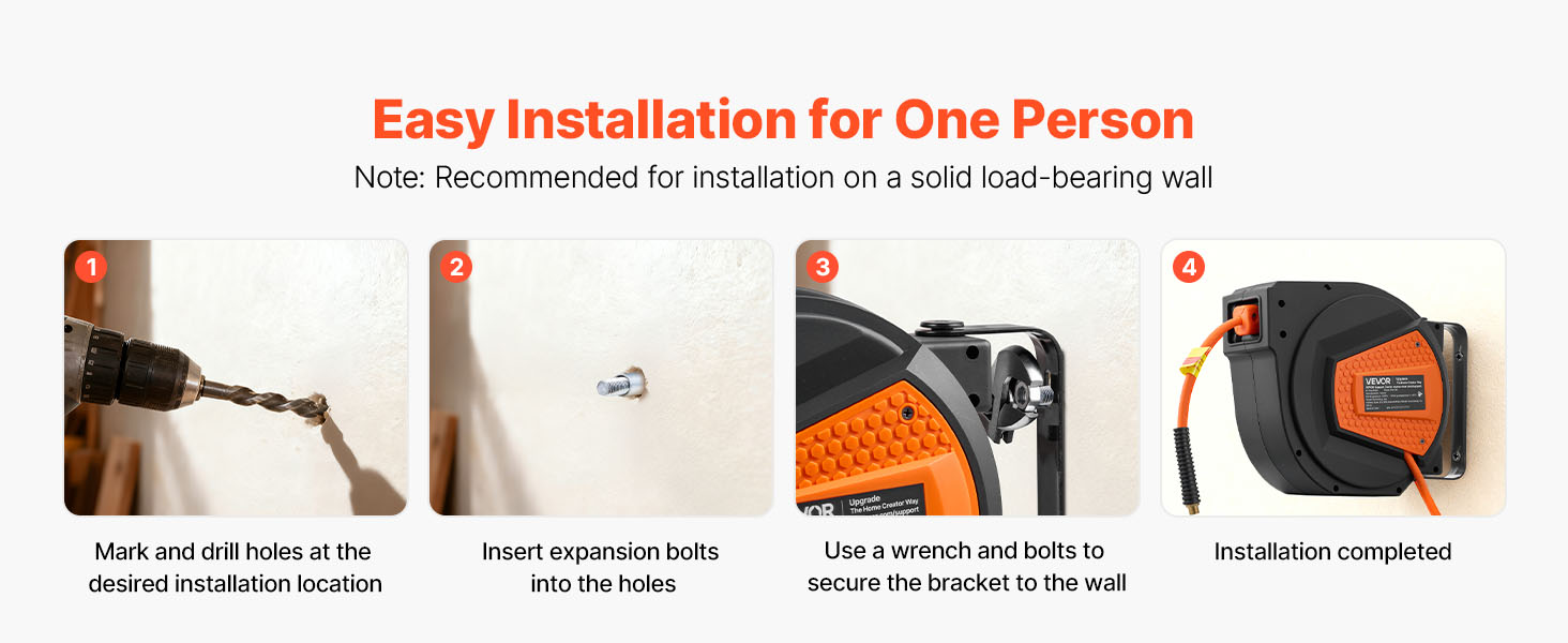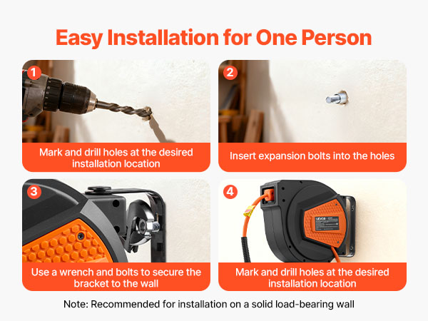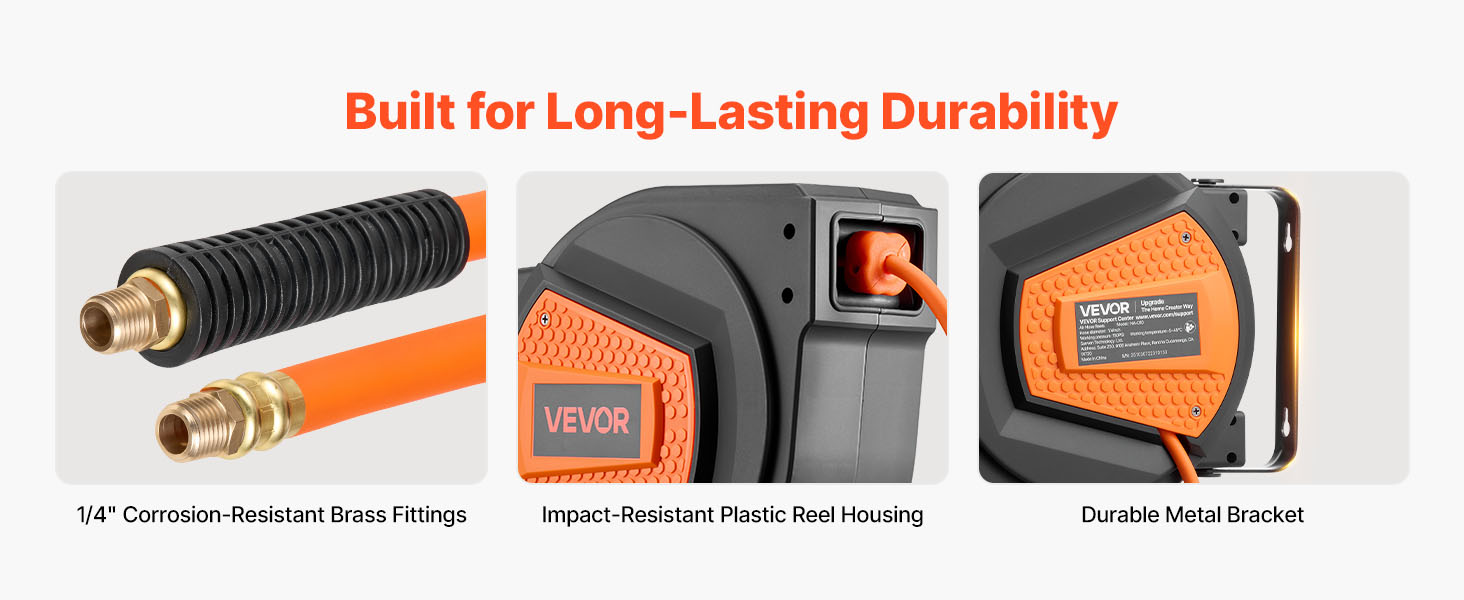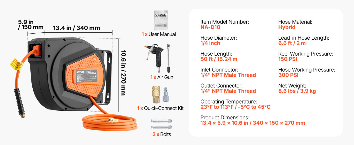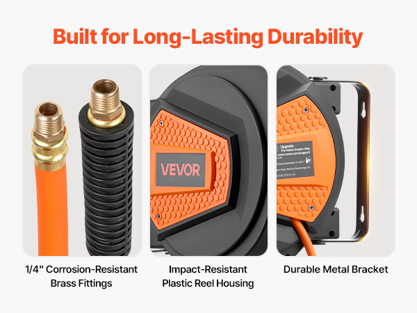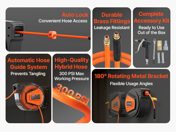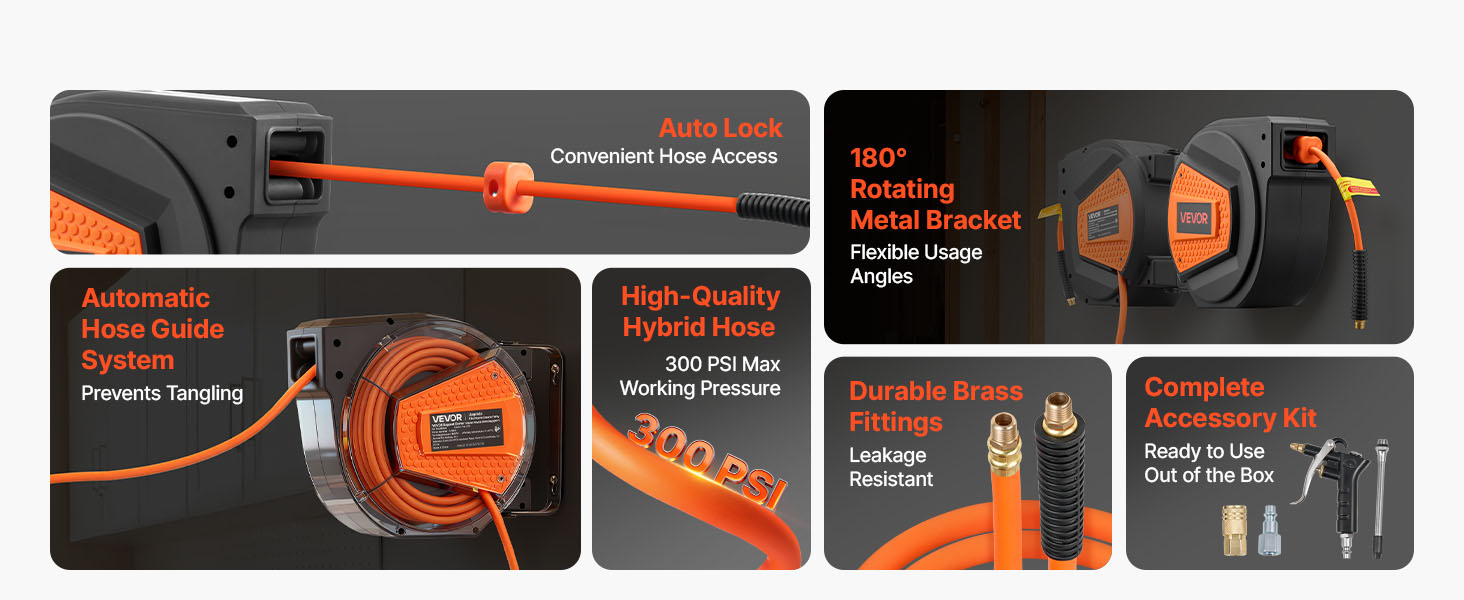 - No More Tangled Hose: The VEVOR retractable air hose reel includes a 1/4 inch x 50 ft hybrid air hose and a 6.6 ft lead-in hose, designed to keep your workspace neat and tangle-free. Eliminates floor-dragging hoses, reducing wear and tripping hazards for enhanced safety and secure operation.