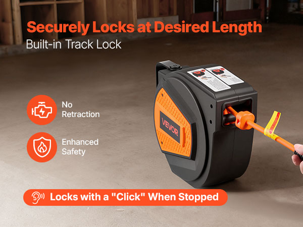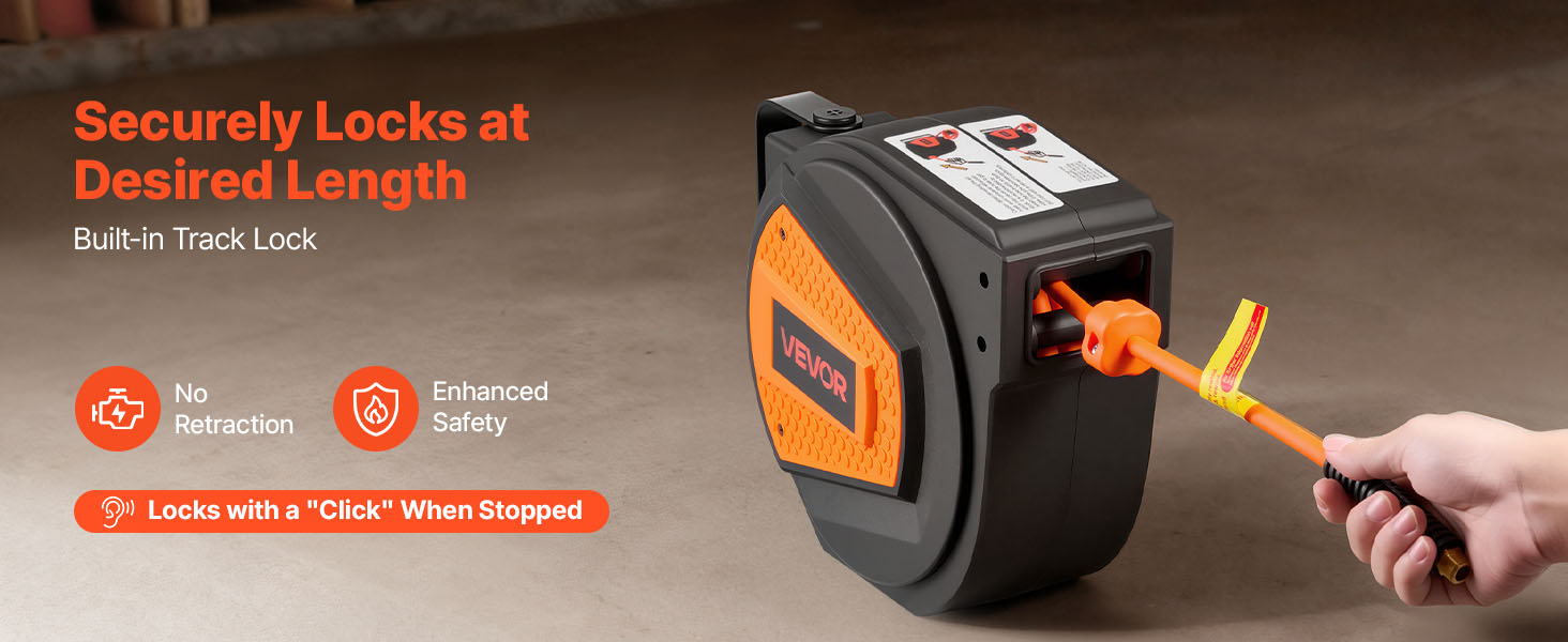 Our auto rewind air hose reel features a built-in locking mechanism that lets you adjust the hose length easily and securely lock it at the desired position.